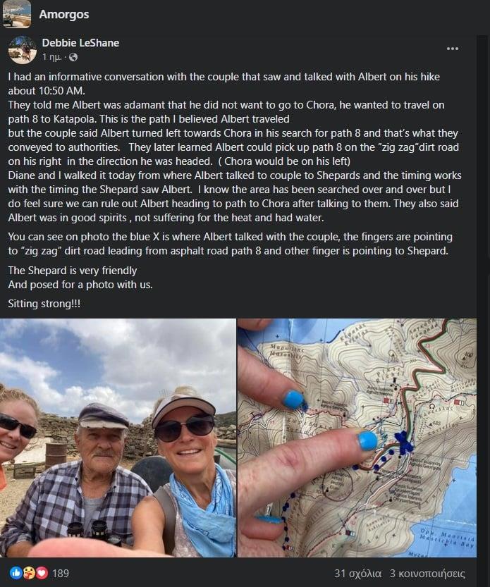 «Είχα μια συζήτηση με το ζευγάρι που είδε και μίλησε με τον Albert στην πεζοπορία του περίπου στις 10:50 π.μ. Μου είπαν ότι ο Albert δεν ήθελε να πάει στη Χώρα, ήθελε να ταξιδέψει στο μονοπάτι 8 για τα Κατάπολα. Αυτό είναι το μονοπάτι στο οποίο πίστευα ότι κινήθηκε ο Albert, αλλά το ζευγάρι είπε ότι εκείνος έστριψε αριστερά προς τη Χώρα, αναζητώντας το μονοπάτι 8 και αυτό μετέφεραν στις Αρχές», γράφει η Debbie Leshane στην ανάρτησή της. «Αργότερα έμαθαν ότι ο Άλμπερτ θα μπορούσε να βγει στο μονοπάτι 8 μέσω ένας χωματόδρομου στα δεξιά του, που έκανε ζιγκ ζαγκ, στον δρόμο όπου κατευθύνθηκε».