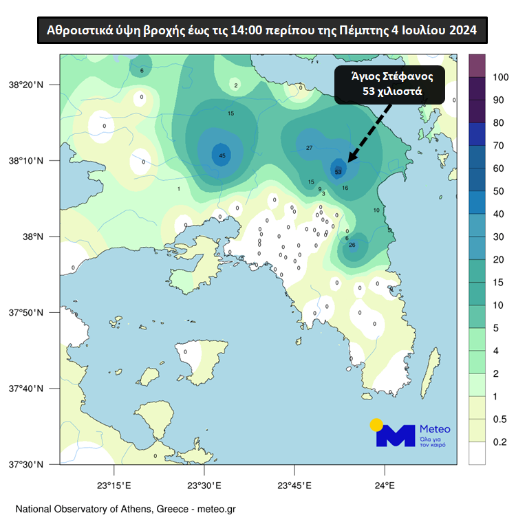 Το meteo παρουσιάζει τα ύψη βροχής που κατέγραψαν οι σταθμοί του δικτύου αυτόματων μετεωρολογικών σταθμών του έως τις 14:00 περίπου. Όπως προκύπτει, το μεγαλύτερο ύψος βροχής στην Αττική καταγράφηκε στον σταθμό του Αγίου Στεφάνου και ήταν ίσο με 53 χιλιοστά.