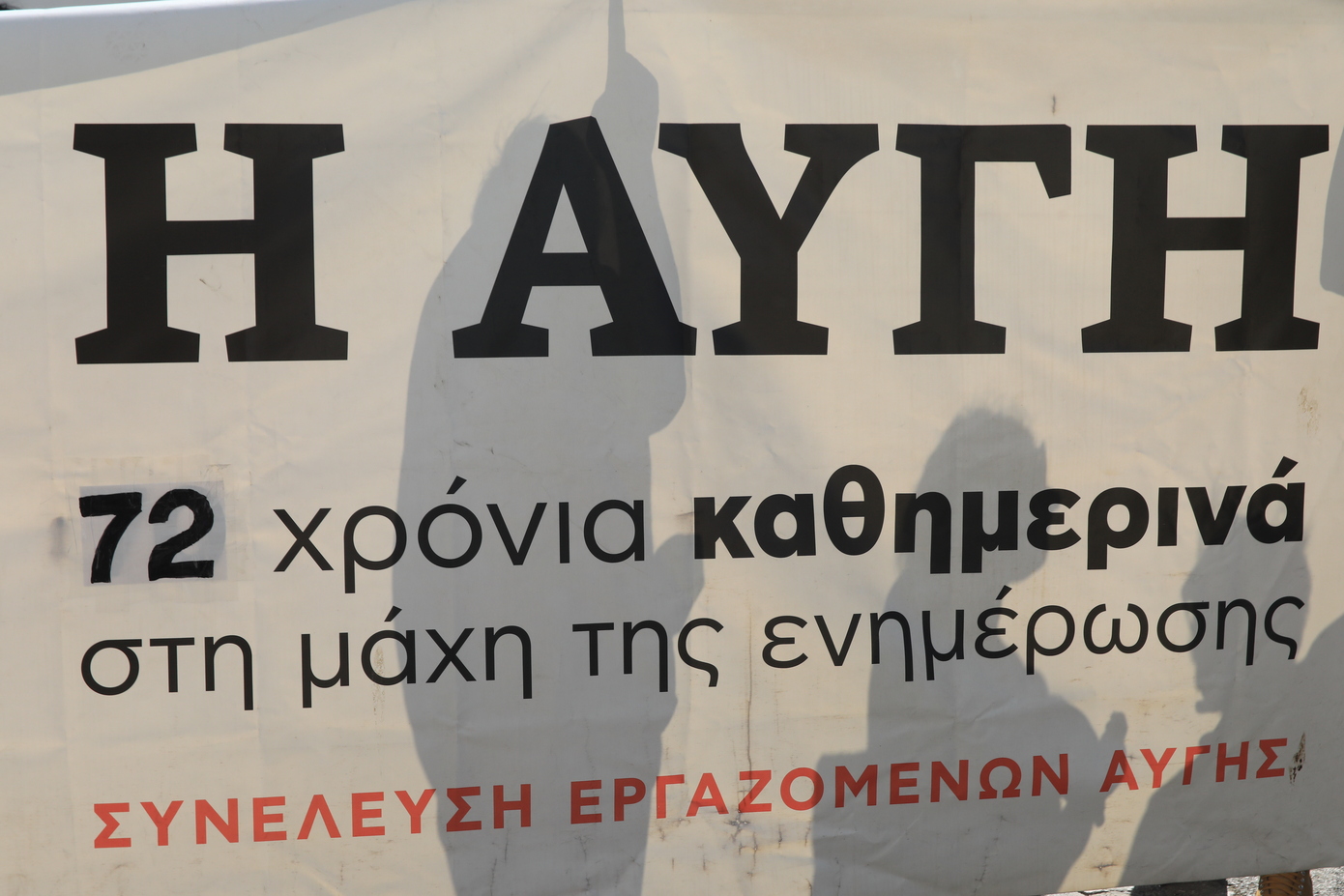 Συγκέντρωση διαμαρτυρίας έξω από κεντρικό ξενοδοχείο της Αθήνας που διεξάγεται η συνεδρίαση της Κεντρικής Επιτροπής του ΣΥΡΙΖΑ, πραγματοποιούν αυτή την ώρα εργαζόμενοι της «Αυγής» λέγοντας «όχι» στο κλείσιμο του καθημερινό φύλλου της εφημερίδας.