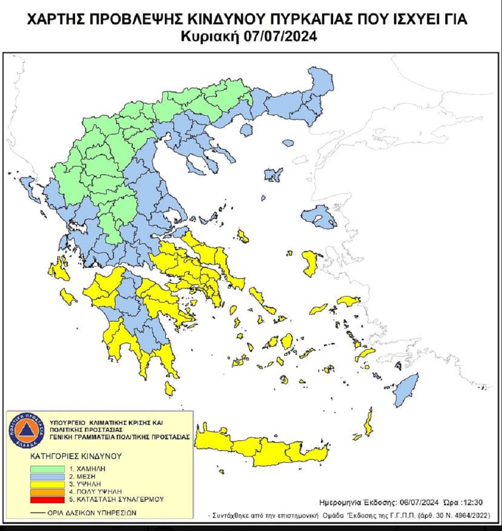 Ο κρατικός μηχανισμός σήμερα Κυριακή 7 Ιουλίου βρίσκεται σε ετοιμότητα λόγω του υψηλού κινδύνου πυρκαγιάς, θέτοντας σε κίτρινη κατηγορία τις περιοχές με υψηλότερες πιθανότητες εκδήλωσης φωτιάς.