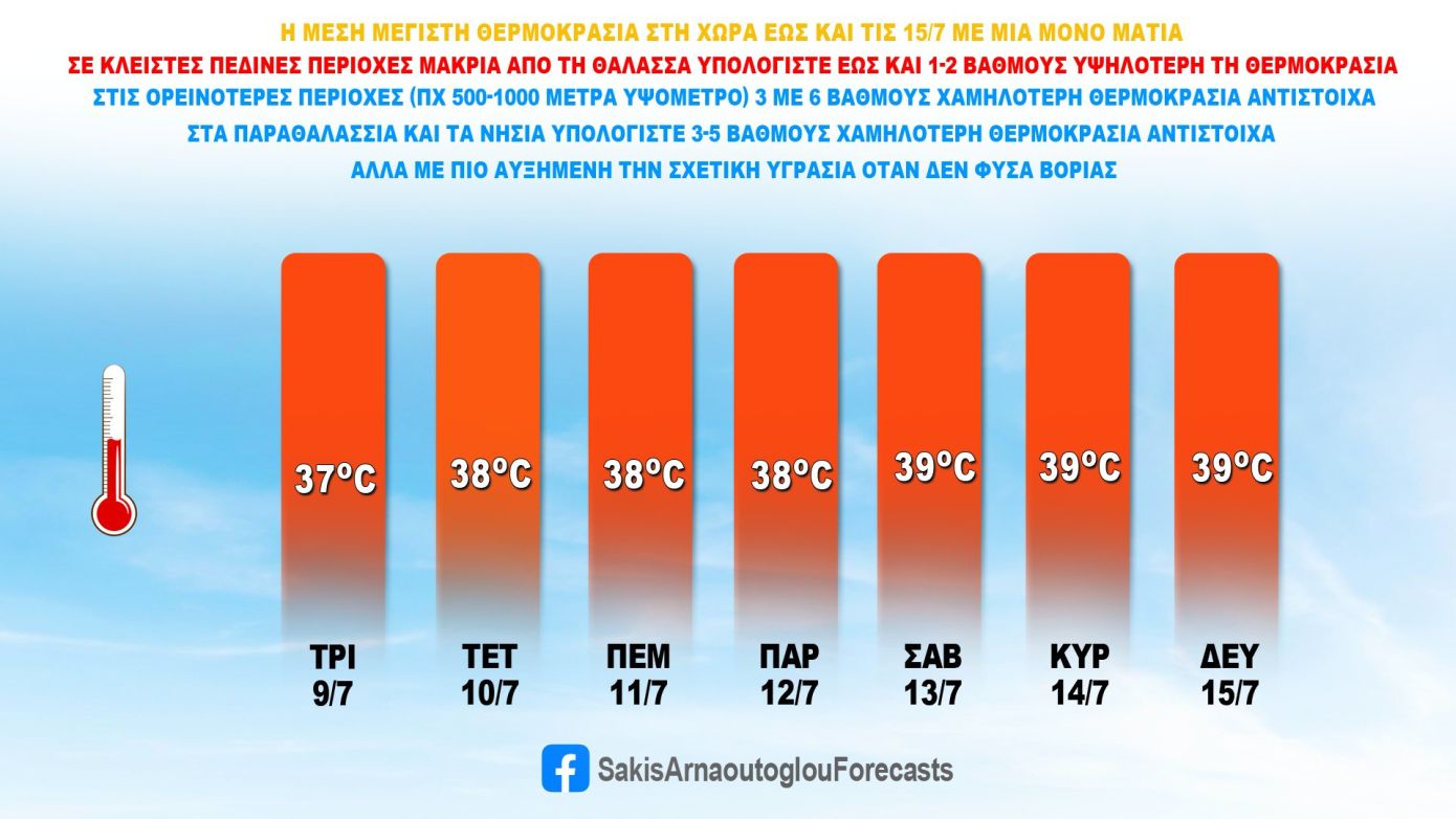 Από την πλευρά του, ο μετεωρολόγος Σάκης Αρναούτογλου ανάρτησε ένα διάγραμμα με τη μέση μέγιστη θερμοκρασία στα πεδινά ηπειρωτικά έως τις 15 Iουλίου.