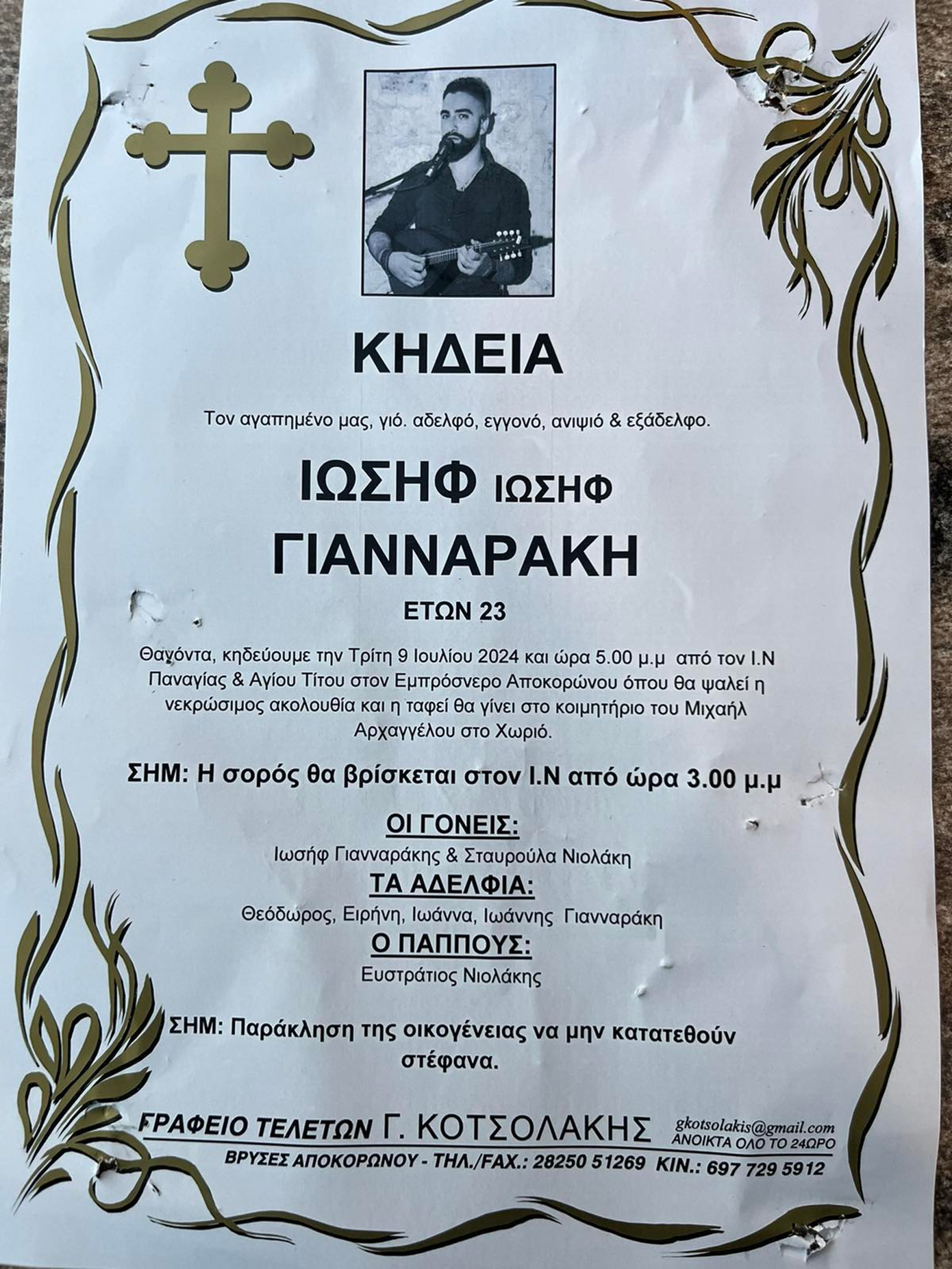 Συγγενείς και φίλοι θα πουν το τελευταίο αντίο στον αδικοχαμένο Σήφη αύριο, Τρίτη στις 17:00, στον Εμπρόσνερο Αποκορώνου, στον Ι.Ν. Παναγίας και Αγίου Τίτου και η ταφή θα γίνει στο κοιμητήριο του Μιχαήλ Αρχάγγελου στο Χωριό, σύμφωνα με το flashnews.gr.