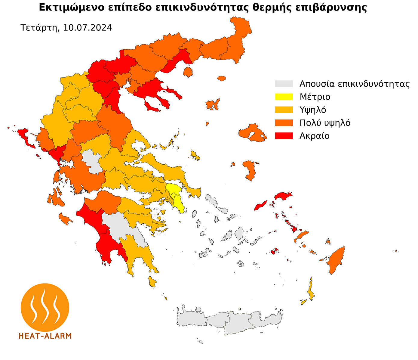 Σύμφωνα με τις τελευταίες διαθέσιμες εκτιμήσεις του συστήματος HEAT-ALARM, αυξημένη επικινδυνότητα λόγω θερμής επιβάρυνσης αναμένεται την Τετάρτη 10 Ιουλίου 2024 σε βόρεια, κεντρικά και δυτικά τμήματα της ηπειρωτικής και νησιωτικής Ελλάδας, όπως και σε νησιά του Ανατολικού Αιγαίου. Όπως φαίνεται στον επόμενο χάρτη, οι περιφερειακές ενότητες που αναμένεται να επηρεαστούν περισσότερο, φτάνοντας έως και το ακραίο επίπεδο επικινδυνότητας, περιλαμβάνουν την Καβάλα, τη Χαλκιδική, το Κιλκίς, την Πέλλα, την Ημαθία, την Πιερία, τη Θεσπρωτία, την Κέρκυρα, την Ηλεία, τη Μεσσηνία, τη Σάμο, την Ικαρία και την Κάλυμνο.