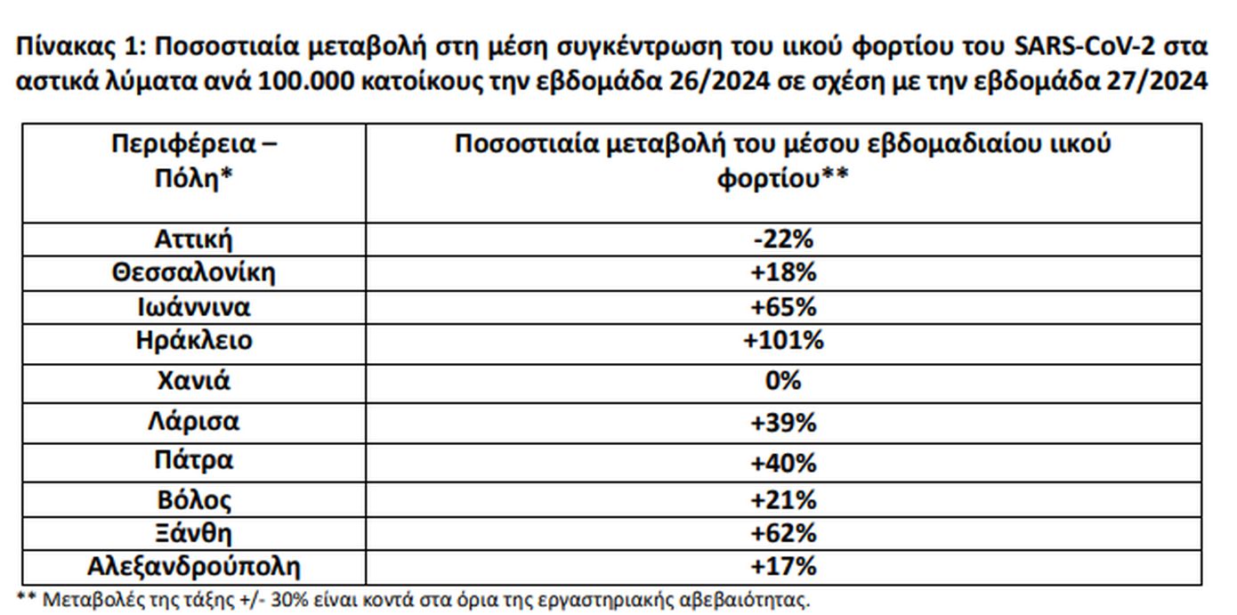 Σύμφωνα με τα στοιχεία που ανακοίνωσε ο ΕΟΔΥ, την προηγούμενη εβδομάδα παρατηρήθηκε αυξητική τάση στο μέσο εβδομαδιαίο ιικό φορτίο του SARS-CoV-2 στα αστικά λύματα σε οκτώ από τις δέκα (8/10) περιοχές που ελέγχθηκαν από το Εθνικό Δίκτυο Επιδημιολογίας Λυμάτων (ΕΔΕΛ) του ΕΟΔΥ.