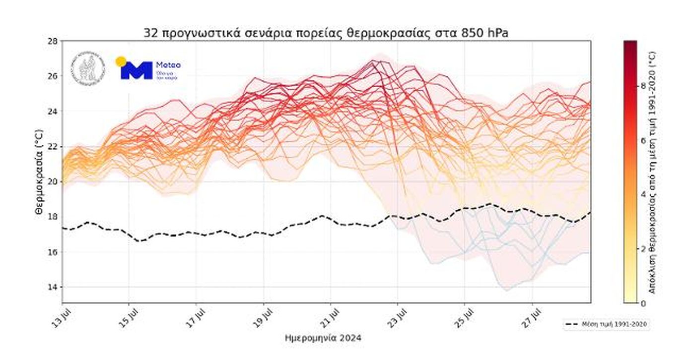 Το γράφημα παρουσιάζει 32 προγνωστικά σενάρια από τις 13 έως 28 Ιουλίου 2024 από το Εθνικό Κέντρο Περιβαλλοντικών Προγνώσεων των ΗΠΑ, για την πορεία της θερμοκρασίας σε ύψος περίπου 1.500 μ πάνω από τη μέση στάθμη της θάλασσας, ύψος στο οποίο μελετούμε την πορεία των αερίων μαζών. Όλα σχεδόν τα σενάρια συμφωνούν σε ακραία θετικές αποκλίσεις τιμών θερμοκρασίας από τη μέση κλιματική τιμή της περιόδου 1991-2020.