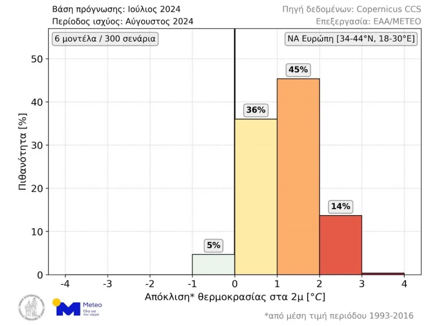 Θερμότερος του κανονικού αναμένεται να είναι ο ερχόμενος Αύγουστος στην ΝΑ Ευρώπη (συμπεριλαμβανομένης της Ελλάδας) σύμφωνα με τις μακροπρόθεσμες προγνώσεις που εκδόθηκαν μέσα στον Ιούλιο. Όπως φαίνεται στο παρακάτω γράφημα, σύμφωνα με το 95 % των διαθέσιμων σεναρίων η μέση θερμοκρασία Αυγούστου θα είναι υψηλότερη από τα κανονικά για την εποχή επίπεδα (περίοδος αναφοράς: 1993-2016). Πιο συγκεκριμένα, τα πιθανότερα σενάρια είναι να σημειωθούν αποκλίσεις της τάξης των 1-2 °C (45 %) και 0-1 °C (36 %). Η πιθανότητα για μέσες θερμοκρασιακές αποκλίσεις άνω των 2 °C είναι 14 %.