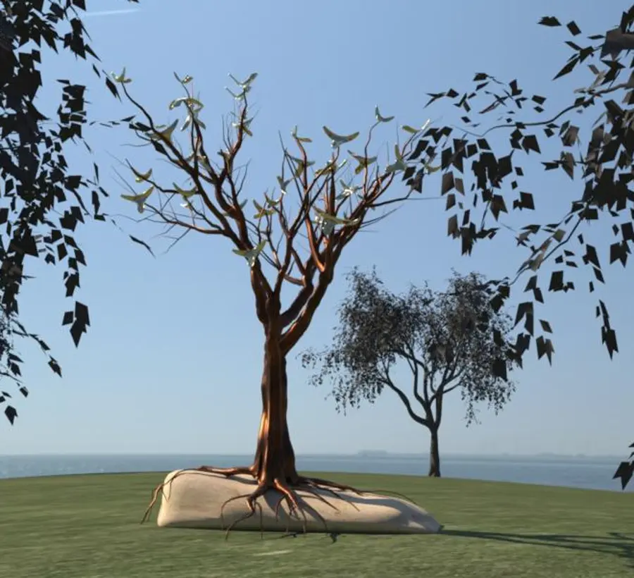 Ένας μαρμάρινος ασύμμετρος βράχος θα στηθεί σε λίγο καιρό στη μαρμάρινη προβλήτα που βρίσκεται στην παλιά παραλία της Θεσσαλονίκης. Πάνω του θα ριζώνει ένα μεταλλικό δέντρο με ανοιγμένα τα κλαδιά του προς τον ουρανό. Στη βάση του δέντρου και στα κλαδιά θα υπάρχουν διάσπαρτα φύλλα με σκοπό να σηματοδοτήσουν τη συνέχεια της ζωής, μετά από το τραγικό δυστύχημα των Τεμπών. Το γλυπτό με τίτλο «Το δέντρο της μνήμης (το τέλος)» θα τοποθετηθεί στη Θεσσαλονίκη, το τέλος μιας σιδηροδρομικής διαδρομής που ξεκίνησε από την Αθήνα και ένωσε τις δύο πόλεις σε ένα κοινό δράμα.