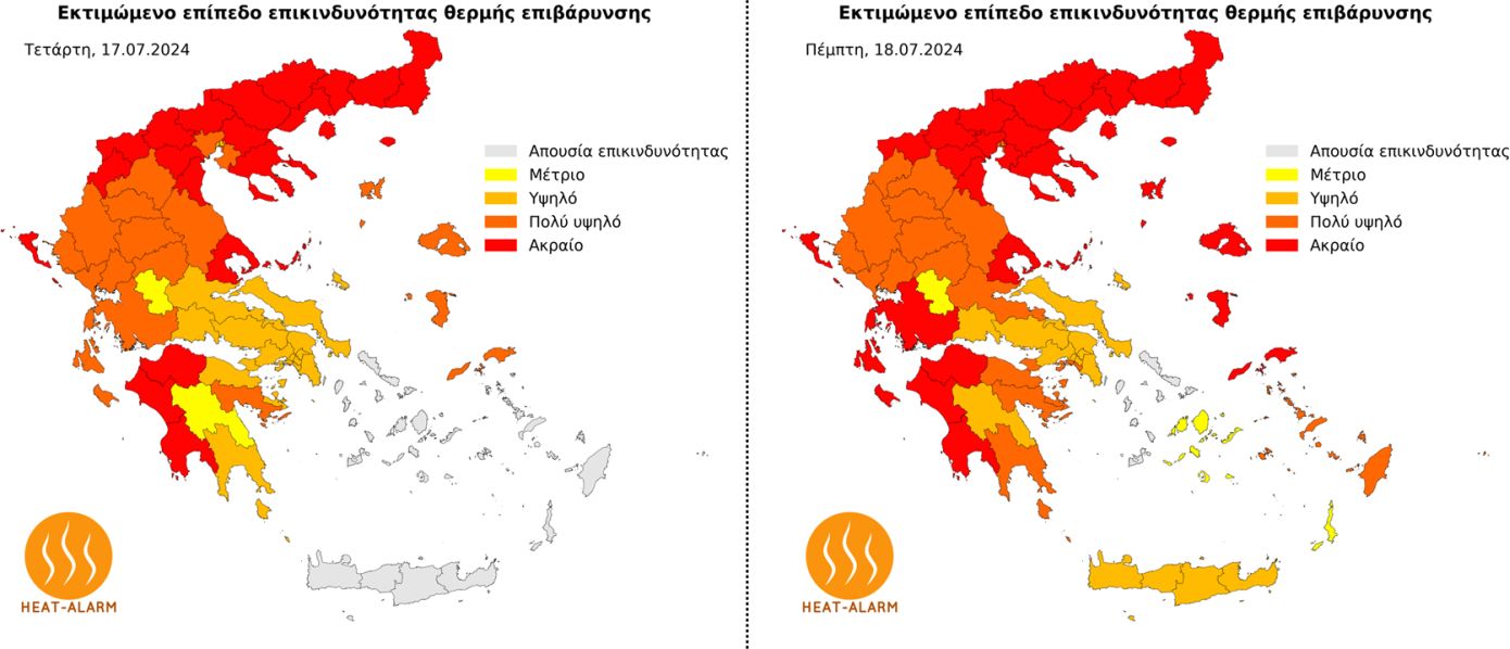 Πιο συγκεκριμένα, σύμφωνα με το βιομετεωρολογικό σύστημα προειδοποίησης HEAT-ALARM και όπως διακρίνεται στην παρακάτω ομάδα χαρτών, ακραία θερμή επιβάρυνση και σχετική επικινδυνότητα αναμένεται την Τετάρτη 17 και την Πέμπτη 18 Ιουλίου 2024 στο σύνολο της Αν. Μακεδονίας και Θράκης (Έβρος, Ροδόπη, Ξάνθη, Δράμα, Καβάλα, Θάσος), σε περιοχές της Κ. και Δ. Μακεδονίας (Σέρρες, Κιλκίς, Λαγκαδάς-Βόλβη, Χαλκιδική, Πέλλα, Ημαθία, Πιερία, Φλώρινα, Καστοριά), στις περιφερειακές ενότητες Μαγνησίας, Σποράδων, Ιόνιων Νήσων (Κέρκυρας, Ζακύνθου, Ιθάκης, Κεφαλληνίας, Λευκάδας) και Βορείου Αιγαίου (Λήμνου, Λέσβου, Χίου, Ικαρίας, Σάμου), στη Δ. Πελοπόννησο (Αχαΐα, Ηλεία, Μεσσηνία) και την Αιτωλοακαρνανία.