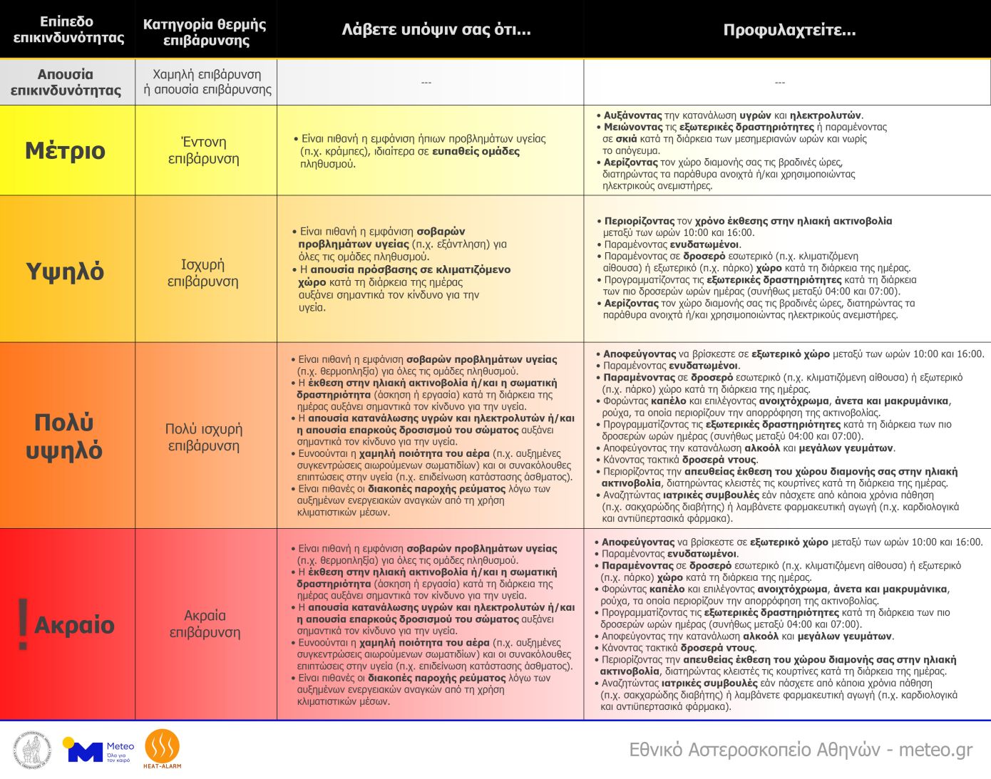 Τέλος, θα πρέπει να τονιστεί ότι οι συνθήκες παρατεταμένης θερμής επιβάρυνσης σε συνδυασμό με την απουσία δροσισμού και θερμικής ανακούφισης κατά τη διάρκεια της νύχτας αυξάνουν σημαντικά την επικινδυνότητα για την ανθρώπινη υγεία. Για αυτό συνίσταται ισχυρά η εφαρμογή μέτρων προστασίας (π.χ. τακτικά δροσερά ντους) από όλες τις πληθυσμιακές ομάδες, και ιδιαίτερα από τις περισσότερο ευπαθείς (ηλικιωμένοι/ες, εργαζόμενοι/ες σε εξωτερικούς χώρους, παιδιά, εγκυμονούσες, άνθρωποι που πάσχουν από χρόνιες παθήσεις κ.α.). Περισσότερες σχετικές πληροφορίες παρέχονται στην επόμενη εικόνα.