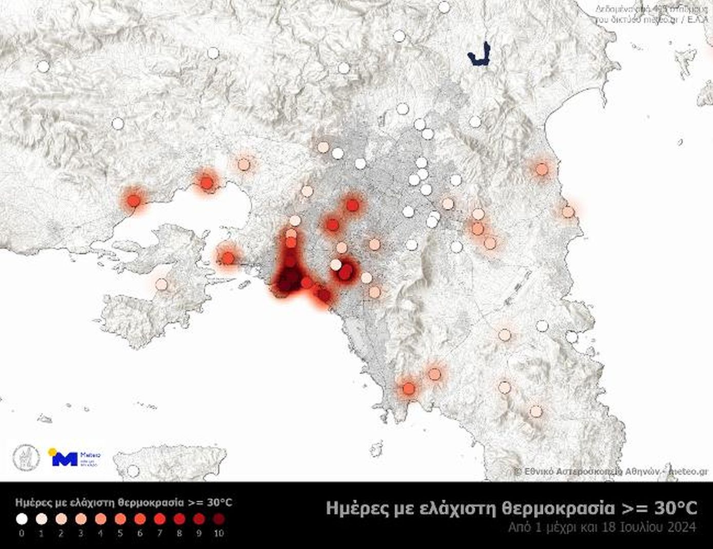 Στους παρακάτω χάρτες αποτυπώνονται οι ημέρες με ελάχιστη θερμοκρασία μεγαλύτερη ή και ίση των 30°C από τις αρχές Ιουλίου μέχρι και σήμερα από τις καταγραφές του δικτύου αυτόματων μετεωρολογικών σταθμών του meteo.gr / Εθνικού Αστεροσκοπείου Αθηνών. Όπως, παρατηρείται οι σταθμοί με τις περισσότερες ημέρες βρίσκονται στην περιοχή της Αττικής και ειδικότερα στο λεκανοπέδιο της Αττικής (Εικόνα 2), υπάρχουν σταθμοί όπως στον Πειραιά, όπου για 10 συνεχόμενες ημέρες (από τις 09/07) η θερμοκρασία διατηρείται πάνω από τους 30°C καθόλη την διάρκεια της ημέρας (συνολικά > 216 ώρες). Παρόμοια κατάσταση και σε άλλες περιοχές του λεκανοπεδίου της Αττικής όπως στη Νίκαια, στο Νέο Κόσμο και στη Νέα Σμύρνη.