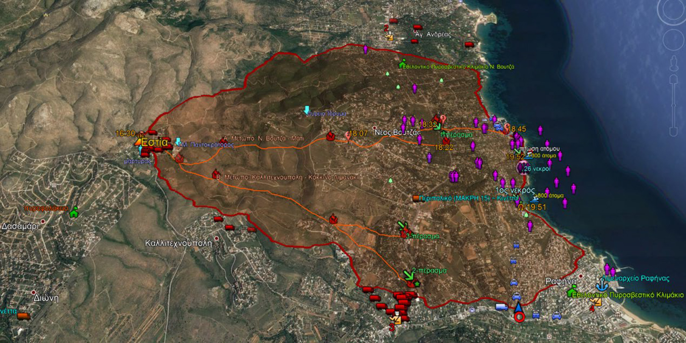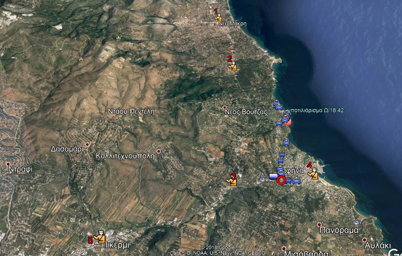 • Τα πορτοκαλί οχήματα είναι τα δύο περιπολικά που είχαν μετακινηθεί στην Κινέτα, το πρωί της ίδιας ημέρας, με αποτέλεσμα να υπάρξει κενό στον εντοπισμό και στην αντιμετώπιση της πυρκαγιάς.