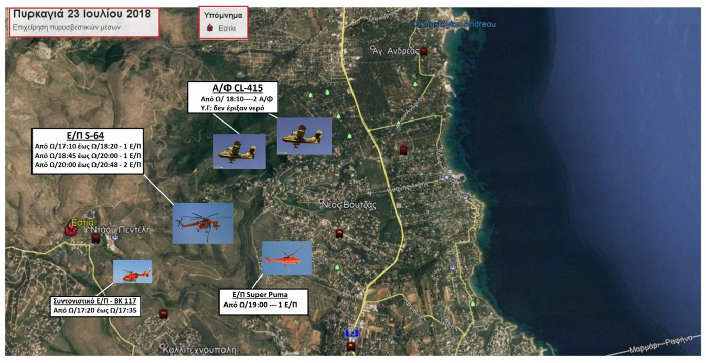 Στις 16:50 εκτρέπεται ελικόπτερο από την περιοχή της Κινέτας και στις 17:10 ενημερώνει για την επικινδυνότητα πυρκαγιάς. Στις 17:20 το συντονιστικό κέντρο ενημερώνεται για φλόγες στις αυλές και από τον αξιωματικό που επέβαινε στο συντονιστικό ελικόπτερο. Τα αεροπλάνα δυστυχώς δεν μπόρεσαν να επιχειρήσουν εξαιτίας των ανέμων το κρίσιμο χρονικό διάστημα (δεν είχε προβλεφθεί η μετεγκατάστασή τους), ενώ δεύτερο ελικόπτερο που έλαβε εντολή να σηκωθεί τελικά βρέθηκε να επιχειρεί στην Κινέτα!