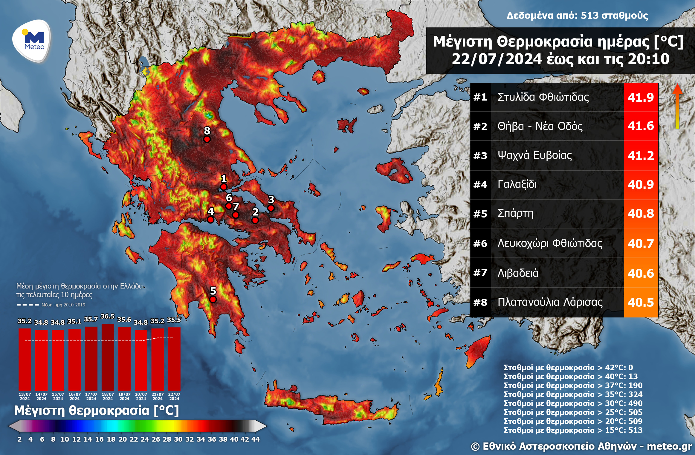 Η μέγιστη θερμοκρασία καταγράφηκε στη Στυλίδα Φθιώτιδας (41.9 °C) και ακολούθησε η Θήβα (41.6 °C) και τα Ψαχνά Ευβοίας (41.2 °C).