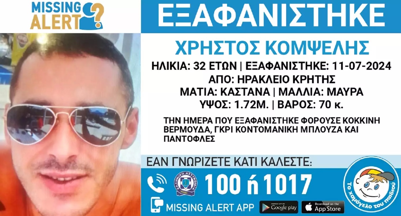 Ακόμη μια εξαφάνιση ενηλίκου σημειώθηκε αυτήν την φορά στο Ηράκλειο της Κρήτης όπου ένας 32χρονος έδωσε τελευταία φορά ίχνη ζωής στις 11 Ιουλίου κι εκ τότε αγνοείται.