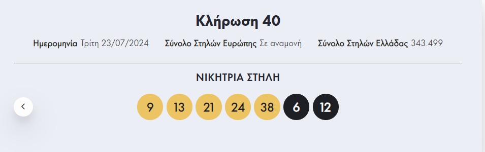Οι τυχεροί αριθμοί είναι οι εξής: 9, 13, 21, 24, 38 και 6, 12.