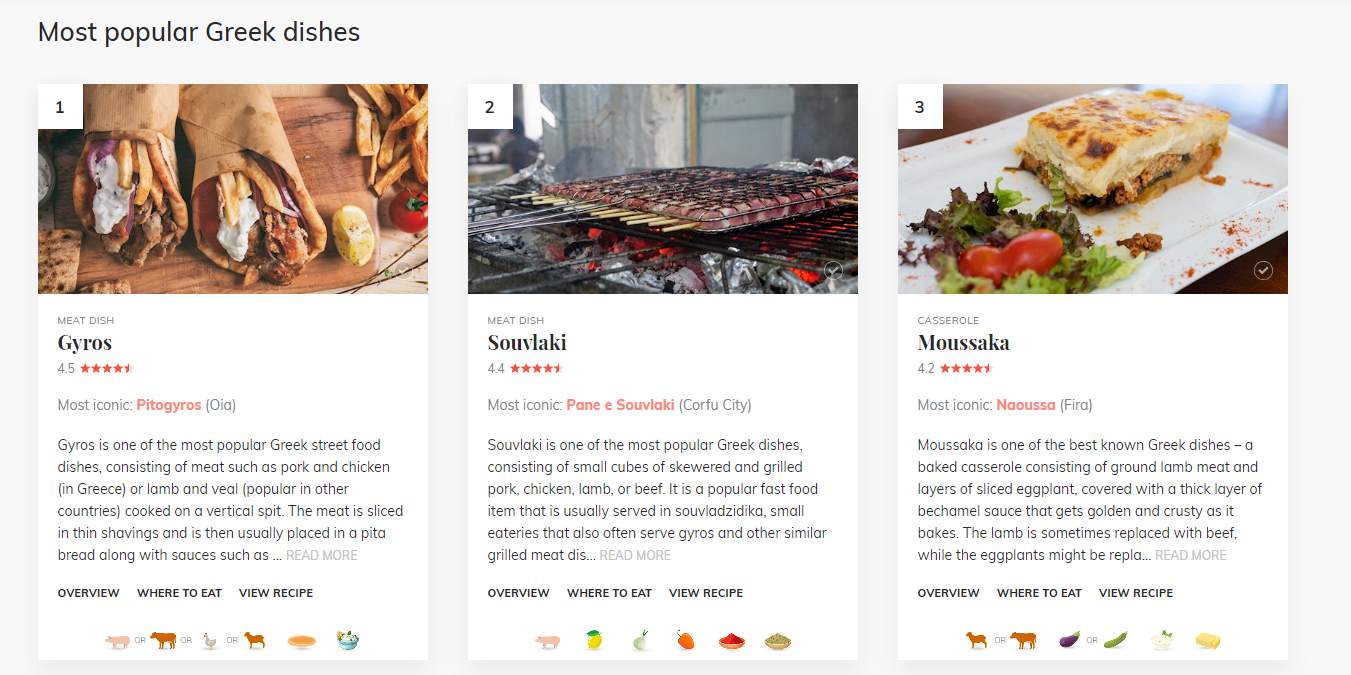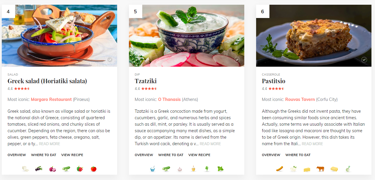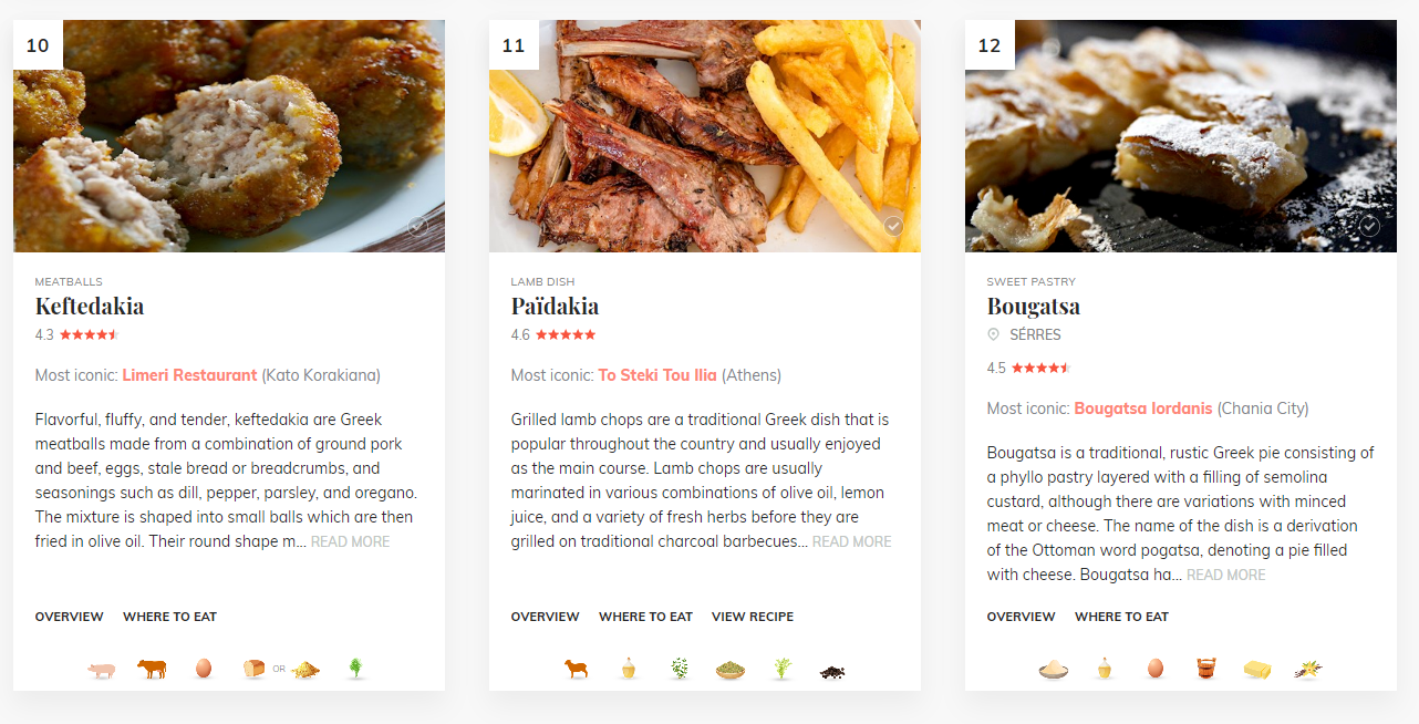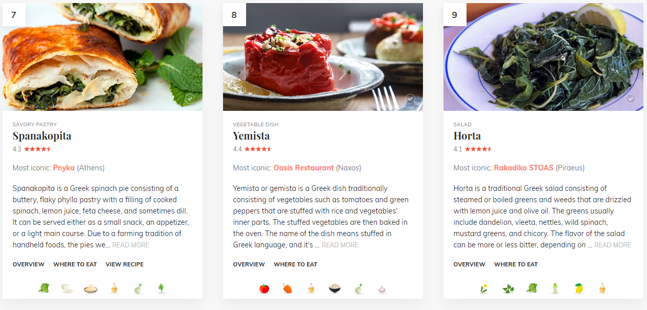 Αν και όπως δείχνει ο χάρτης, τα περισσότερα νησιά που έχουν επιλέγει, έχουν ένα μόνο φαγητό, η Κρήτη έχει τα περισσότερα με πορτοκαλόπιτα, απάκι, μυζήθρα, τσικουδιά, ντάκο, σοφεγάδα, γραβιέρα και μυζηθρόπιτα να είναι στον χάρτη. Άλλα νησιά που υπάρχουν στον χάρτη που ακολουθεί, είναι η Χίος, η Λέσβος, η Σαντορίνη, η Μύκονος και η Σίφνος.