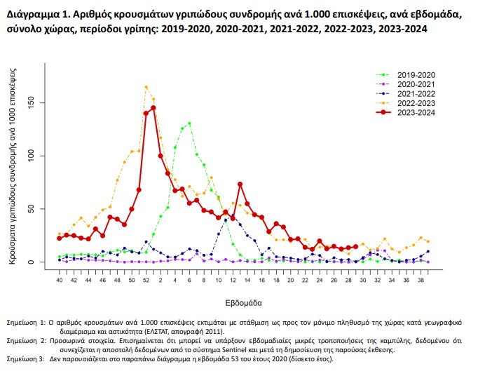 Από την εβδομάδα 40/2023 έως την εβδομάδα 29/2024 νοσηλεύτηκαν 149 άτομα με εργαστηριακά επιβεβαιωμένη γρίπη σε ΜΕΘ και καταγράφηκαν 71 θάνατοι από εργαστηριακά επιβεβαιωμένη γρίπη.