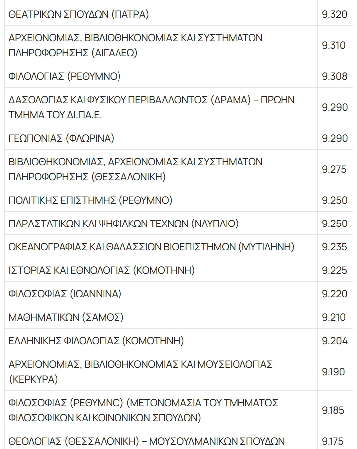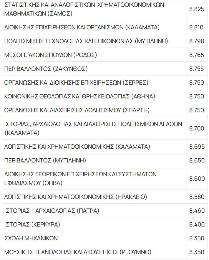 Ακολουθούν οι σχολές με τα υψηλότερα μόρια και αυτές που συγκέντρωσαν κάτω από 10.000 μόρια.