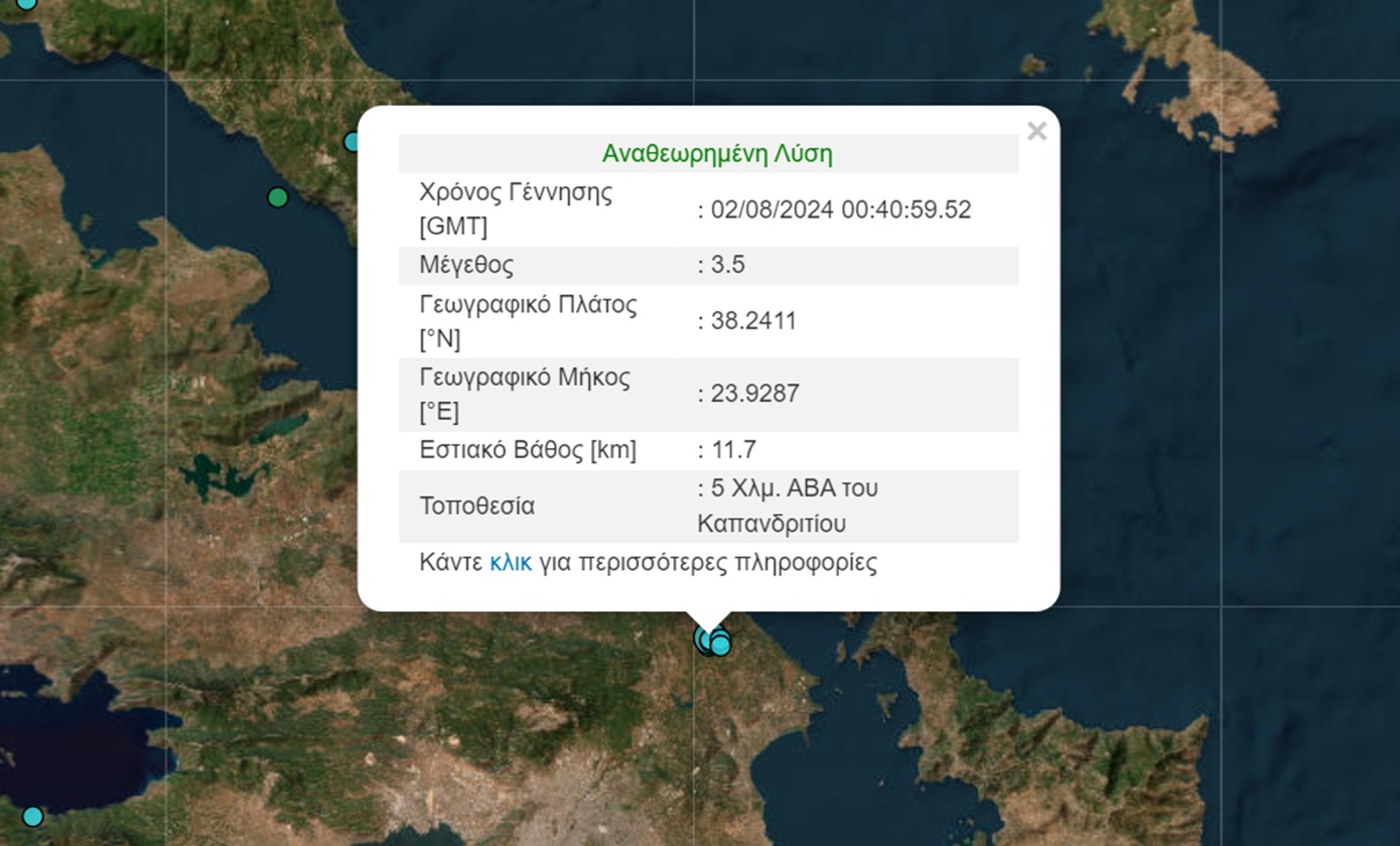 Αναλυτικότερα ο σεισμός σημειώθηκε στις 3:40 και ήταν μεγέθους 3,5 βαθμών της κλίμακας Ρίχτερ ενώ το σημείο καταγράφηκε 5 χιλιόμετρα βορειοανατολικά του Καπανδριτίου με το εστιακό βάθος τα 5 χλμ σύμφωνα με την αναθεωρημένη λύση του Γεωδυναμικού Ινστιτούτου.