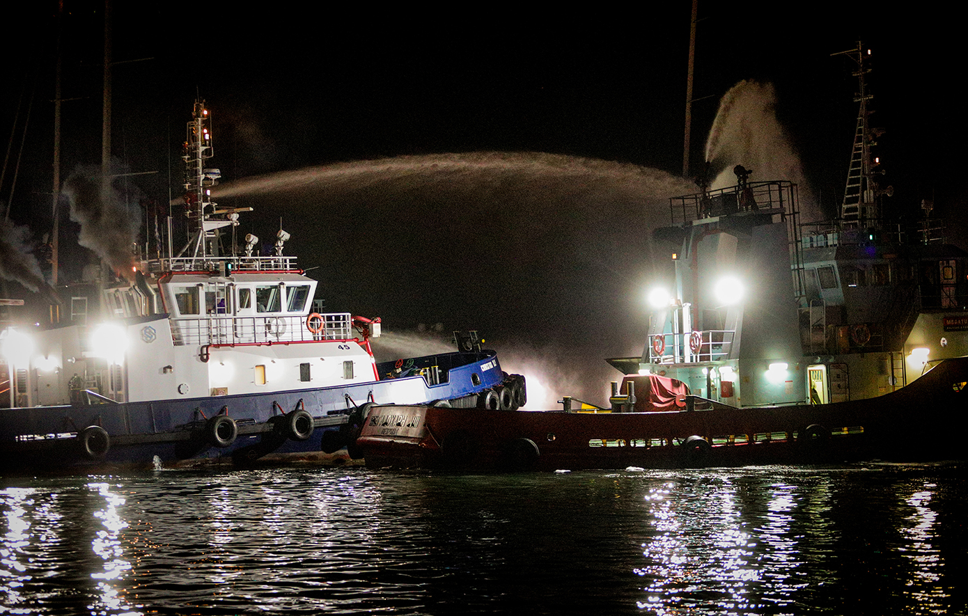 Πλωτό σκάφος του Λιμενικού τους παρέλαβε και τους μετέφερε σε ασφαλές σημείο της Μαρίνας. Στην κατάσβεση συμμετείχαν εννέα οχήματα της πυροσβεστικής υπηρεσίας, καθώς και ένα πλωτό πυροσβεστικό όχημα.