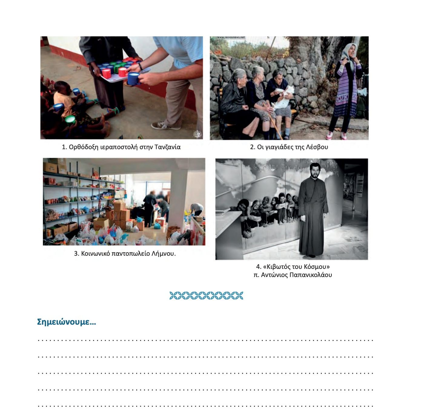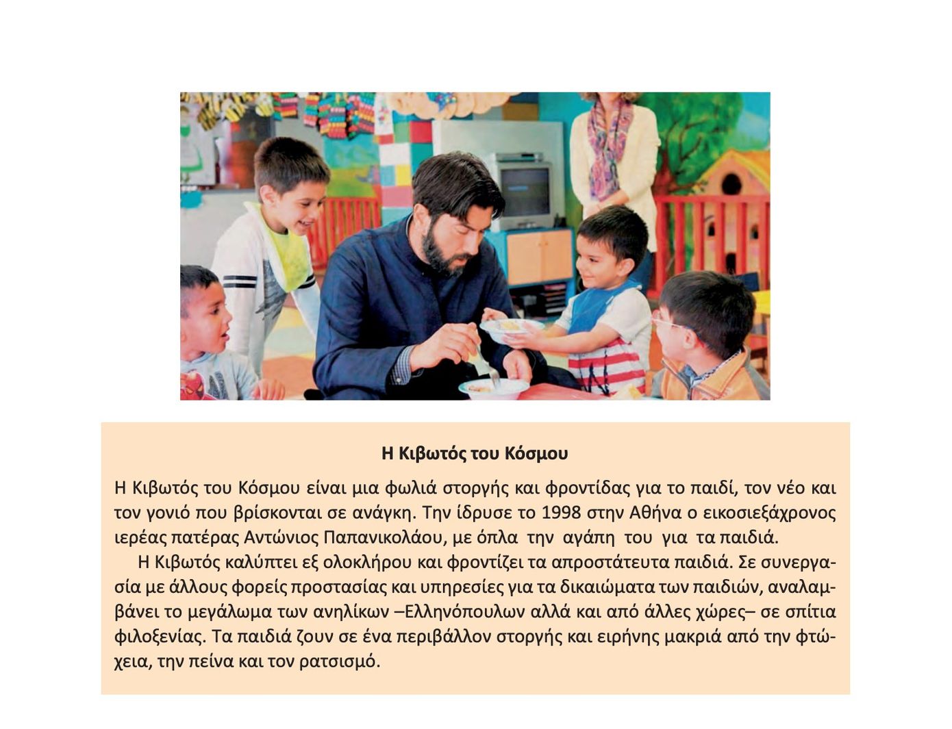 Από το βιβλίο «Η μαρτυρία της Ορθόδοξης Εκκλησίας στον σύγχρονο κόσμο» της Γ’ γυμνασίου, διαγράφεται στη σελίδα 19 η φωτογραφία στο πάνω μέρος και το κείμενο με τίτλο: «Η Κιβωτός του Κόσμου». Στη σελίδα 23 του ίδιου βιβλίου διαγράφεται η δραστηριότητα: «7. Καταγράψτε… Κόσμου».