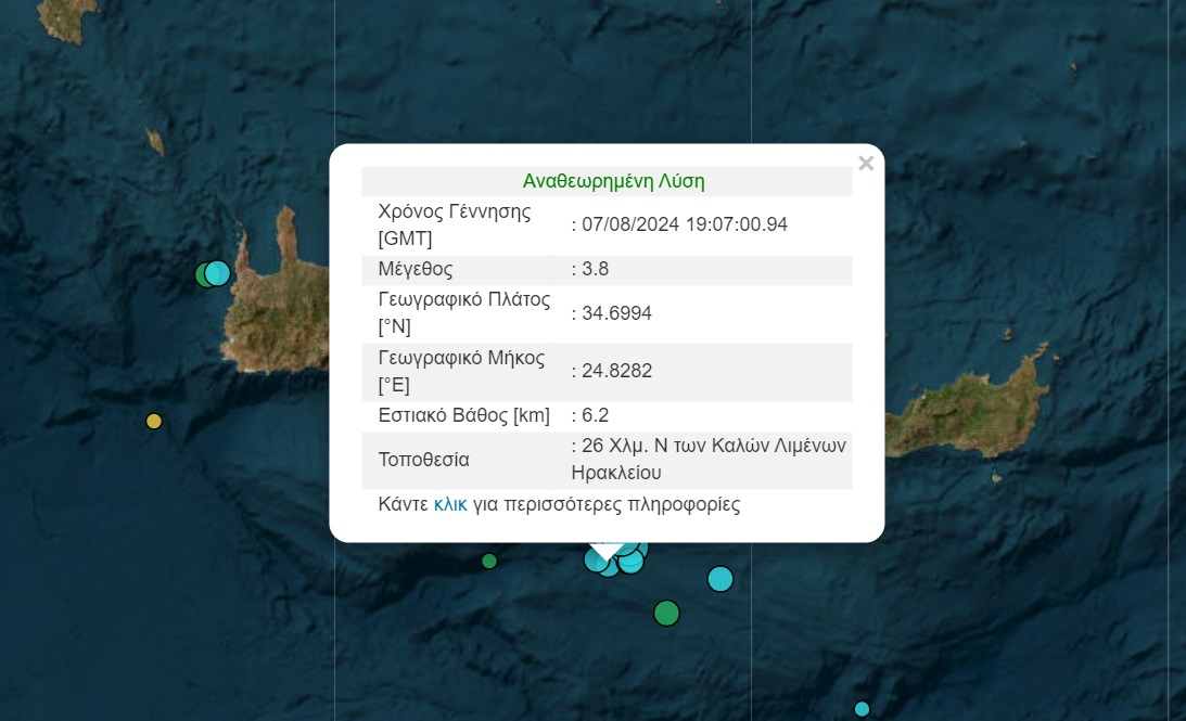 Ο δεύτερος ήταν 3,8 Ρίχτερ και έλαβε χώρα στις 23:07 26 χλμ νότια των Καλών Λιμένων Ηρακλείου με εστιακό βάθος 6,2 χλμ.