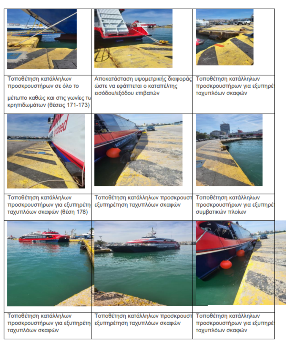 στις γωνίες των κρηπιδωμάτων εξυπηρέτησης δρομολογημένων πλοίων. - Βελτίωση σήμανσης και κατεύθυνσης προς τις πύλες εισόδου/εξόδου.