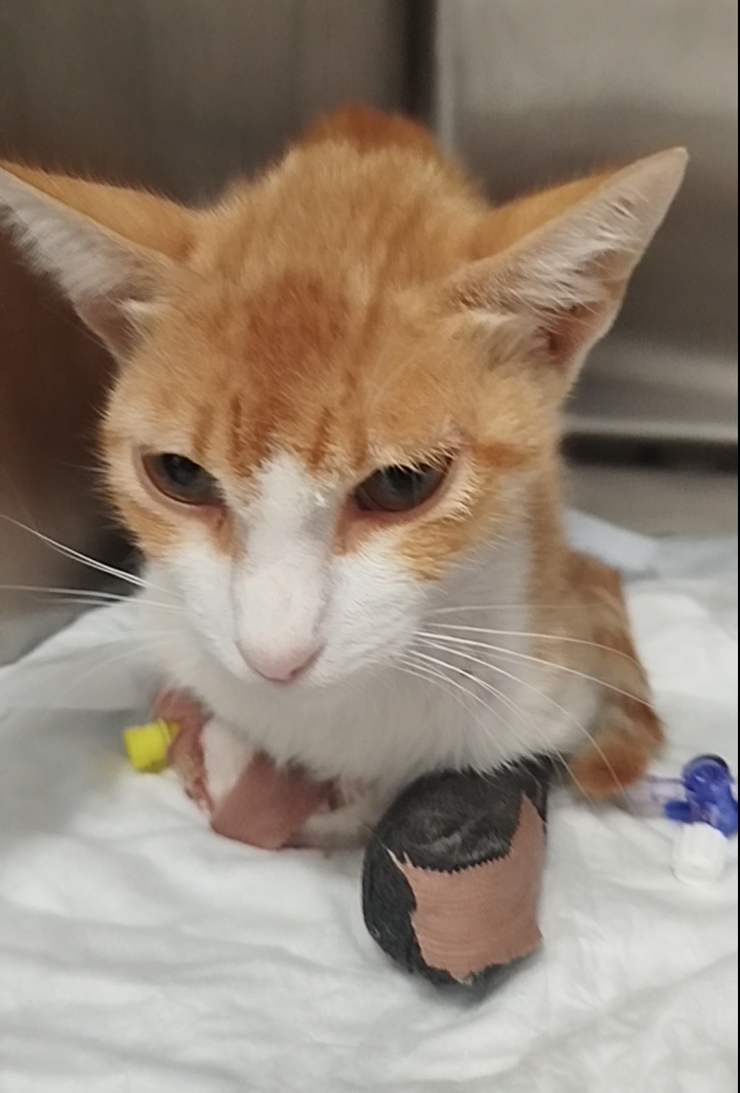 Το γατάκι μεταφέρθηκε στην κτηνιατρική κλινική Αγαθαγγελίδης στη Θεσσαλονίκη για τις πρώτες βοήθειες και περίθαλψη όπου διαπιστώθηκε ότι τα δάχτυλά του σε όλα τα πόδια είναι σχεδόν ακρωτηριασμένα και στα δύο πόδια του κρέμονται τα οστά.