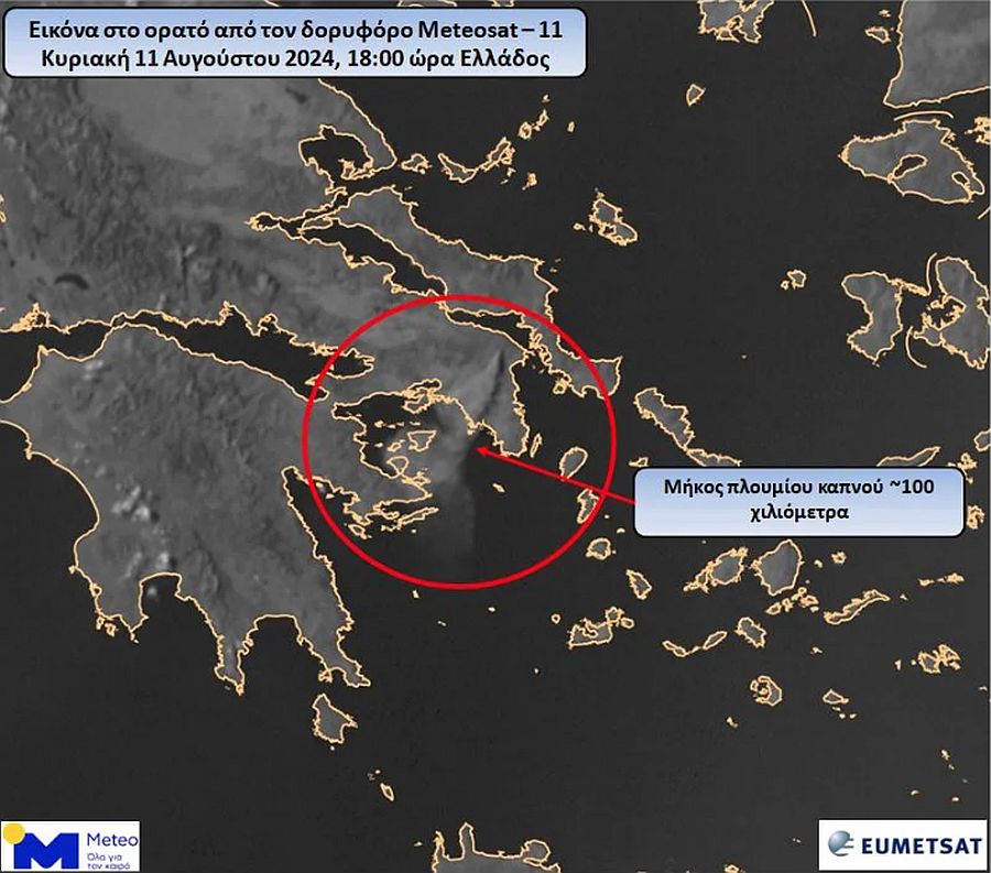 Ο καπνός από την φωτιά στον Βαρνάβα Αττικής καταγράφηκε από τον Ευρωπαϊκό μετεωρολογικό δορυφόρο Meteosat-11.