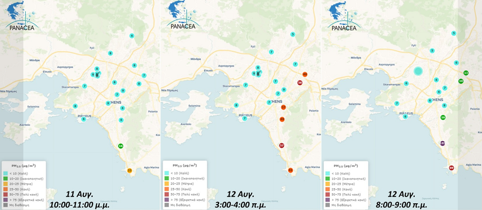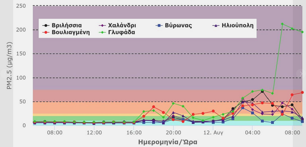 «Σε συνέχεια της ολονύκτιας παρακολούθησης και των ενημερώσεων του Εθνικού Αστεροσκοπείου Αθηνών για τις επικρατούσες συνθήκες και την ταχύτατη εξάπλωση της πυρκαγιάς προς τα νότια υπό την επικράτηση ισχυρών βορείων ανέμων, η οποία από τα ξημερώματα της 12ης Αυγούστου προσέγγισε τις περιοχές Νέας και Παλαιάς Πεντέλης, η εικόνα των μέσων ωριαίων επιπέδων των αιωρούμενων σωματιδίων PM2.5 στην ατμόσφαιρα της Αττικής, μέχρι στιγμής, έχει ως ακολούθως: