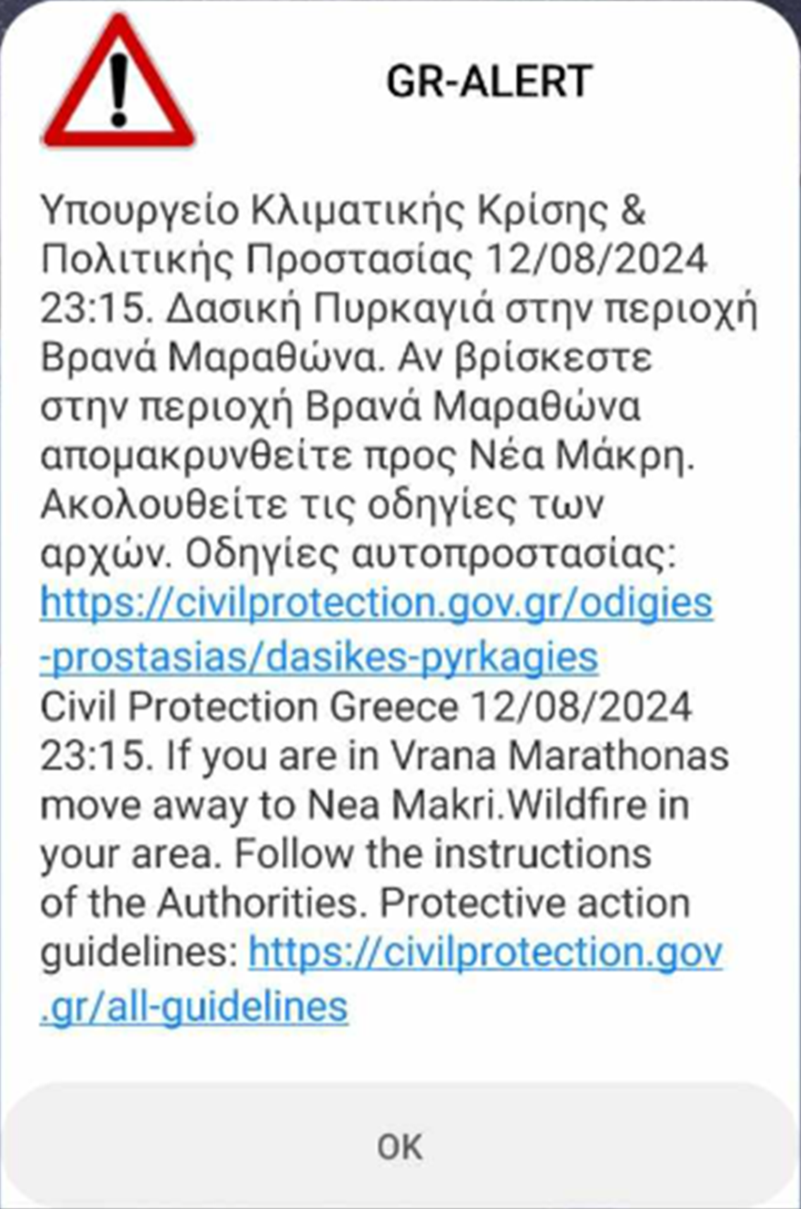 Πριν λίγη ώρα το 112 χτύπησε και πάλι για εκκένωση προειδοποιώντας στους κατοίκους Βρανά Μαραθώνα και το μήνυμα έγραφε χαρακτηριστικά: «Αν βρίσκεστε στην περιοχή Βρανά Μαραθώνα απομακρυνθείτε προς Νέα Μάκρη» ανέφερε το μήνυμα από το 112.