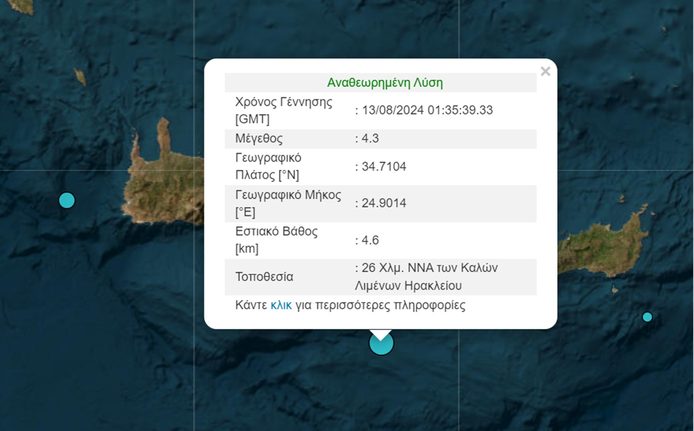 Ο σεισμός μεγέθους 4,3 της κλίμακας Ρίχτερ σημειώθηκε στις 4:35, 26 Χλμ. νοτιοανατολικά των Καλών Λιμένων Ηρακλείου με εστιακό βάθος τα 4,6 χμλ.