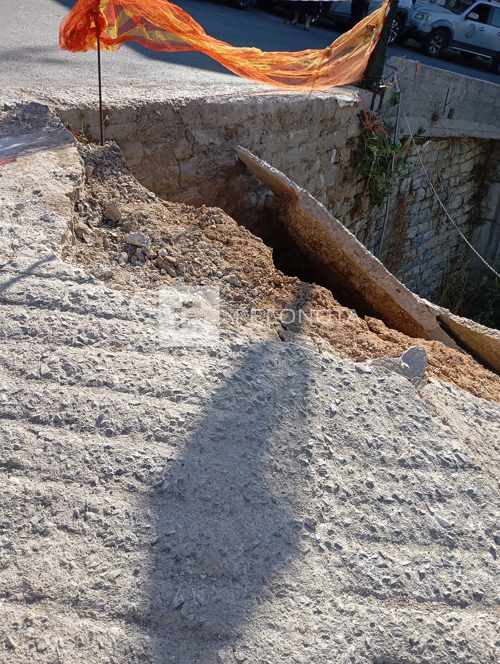 Το τμήμα του δρόμου που βρίσκεται στην είσοδο του πάρκινγκ, «έπεσε» στις 4 τα ξημερώματα, και το τμήμα που υποχώρησε «έσκασε» στο ρέμα.