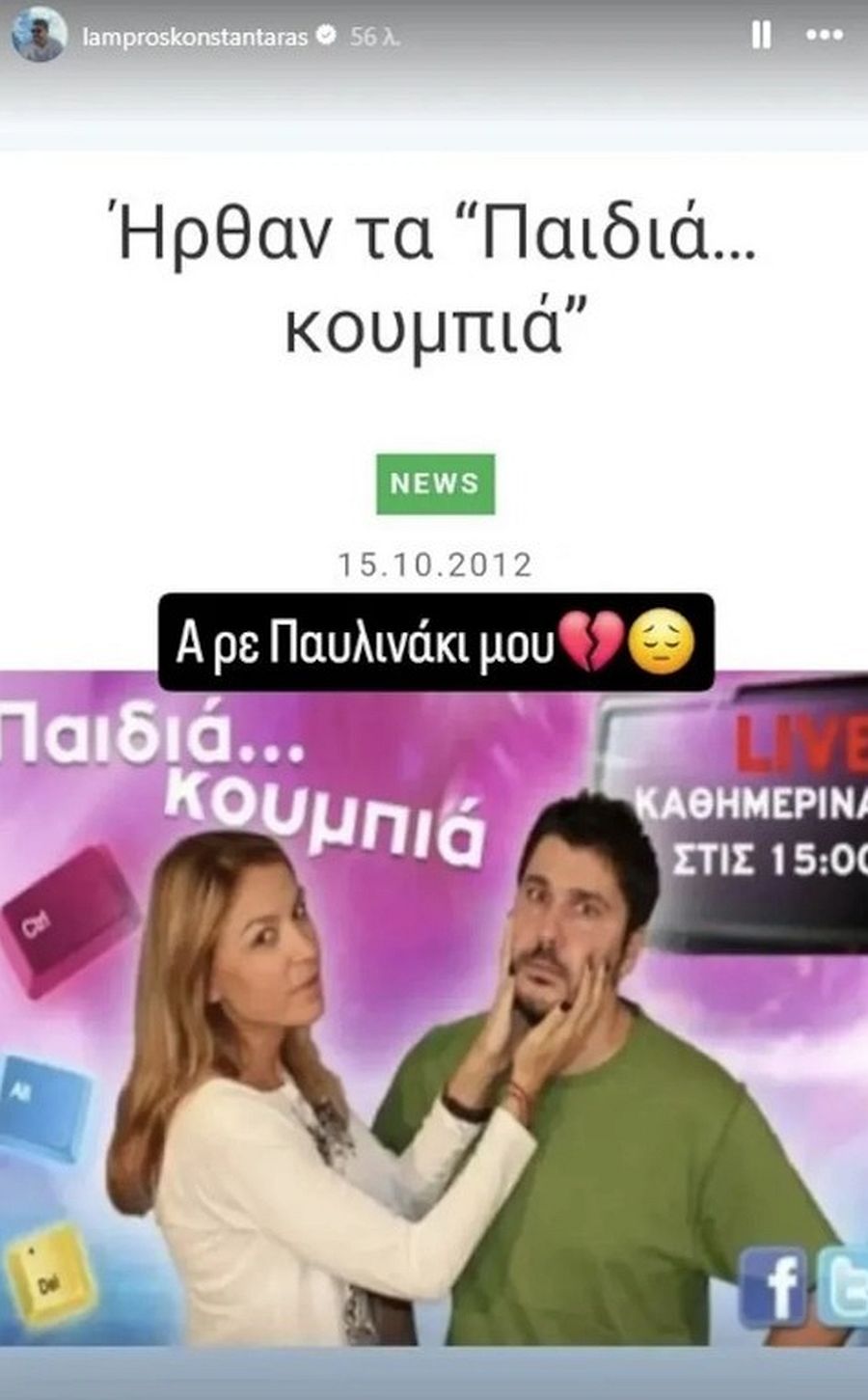 Συγκεκριμένα, τη δυσάρεστη είδηση έκανε γνωστή ο Λάμπρος Κωνσταντάρας, ο οποίος είχε συνεργαστεί μαζί της στο παρελθόν παρουσιάζοντας την εκπομπή «Παιδιά Κουμπιά». Ο δημοσιογράφος δημοσίευσε στον προσωπικό του λογαριασμό στο Instagram μία κοινή τους φωτογραφία, γράφοντας: «Α ρε Παυλινάκι μου».. Διαβάστε περισσότερα εδώ: