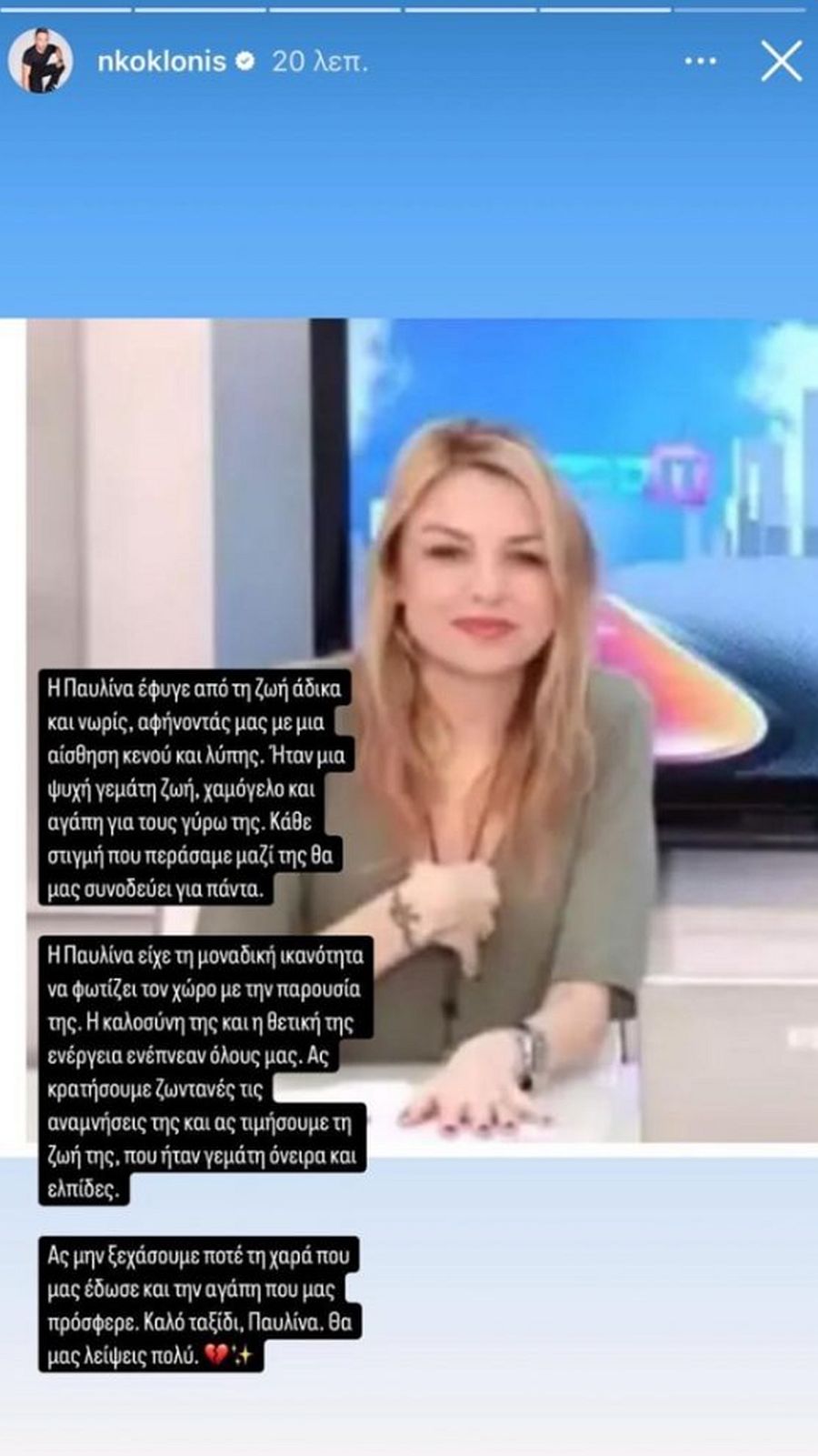 «Η Παυλίνα έφυγε από τη ζωή άδικα και νωρίς, αφήνοντάς μας με μία αίσθηση κενού και λύπης. Ήταν μία ψυχή γεμάτη ζωή, χαμόγελο και αγάπη για τους γύρω της. Κάθε στιγμή που περάσαμε μαζί της θα μας συνοδεύει για πάντα. Η Παυλίνα είχε τη μοναδική ικανότητα να φωτίζει τον χώρο με την παρουσία της. Η καλοσύνη της και η θετική της ενέργεια ενέπνεαν όλους μας. Ας κρατήσουμε ζωντανές τις αναμνήσεις της και ας τιμήσουμε τη ζωή της που ήταν γεμάτη όνειρα και ελπίδες. Ας μην ξεχάσουμε ποτέ τη χαρά που μας έδωσε και την αγάπη που μας προσέφερε. Καλό Ταξίδι Παυλίνα. Θα μας λείψεις πολύ», έγραψε ο Νίκος Κοκλώνης.