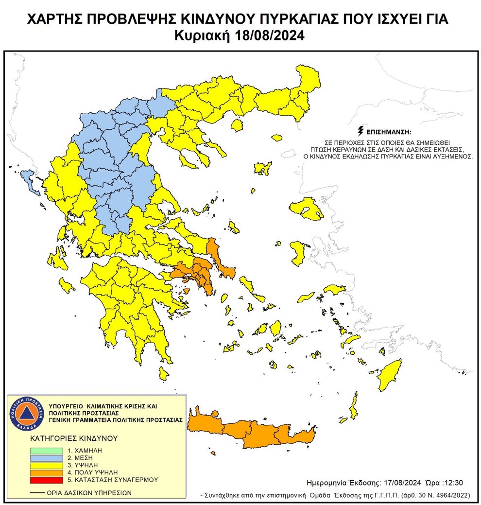 Σύμφωνα με το Χάρτη Πρόβλεψης Κινδύνου Πυρκαγιάς που εκδίδει η Γενική Γραμματεία Πολιτικής Προστασίας του Υπουργείου Κλιματικής Κρίσης και Πολιτικής Προστασίας (civilprotection.gov.gr), για αύριο Κυριακή 18 Αυγούστου 2024, προβλέπεται:
