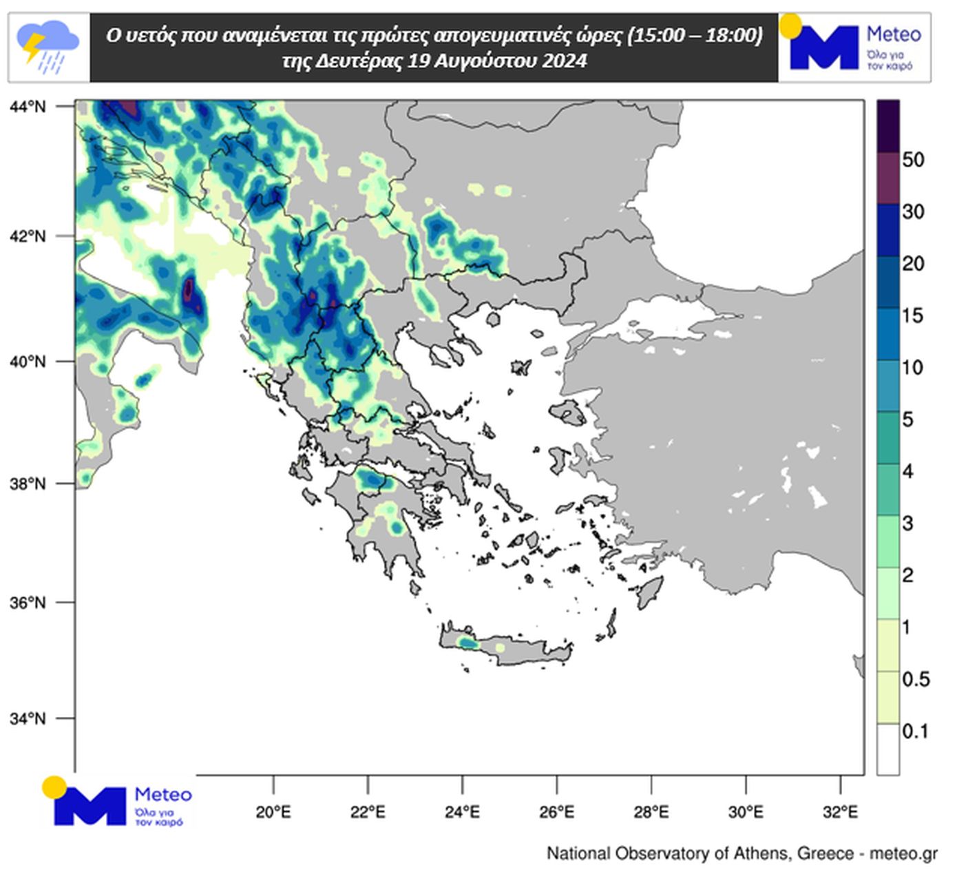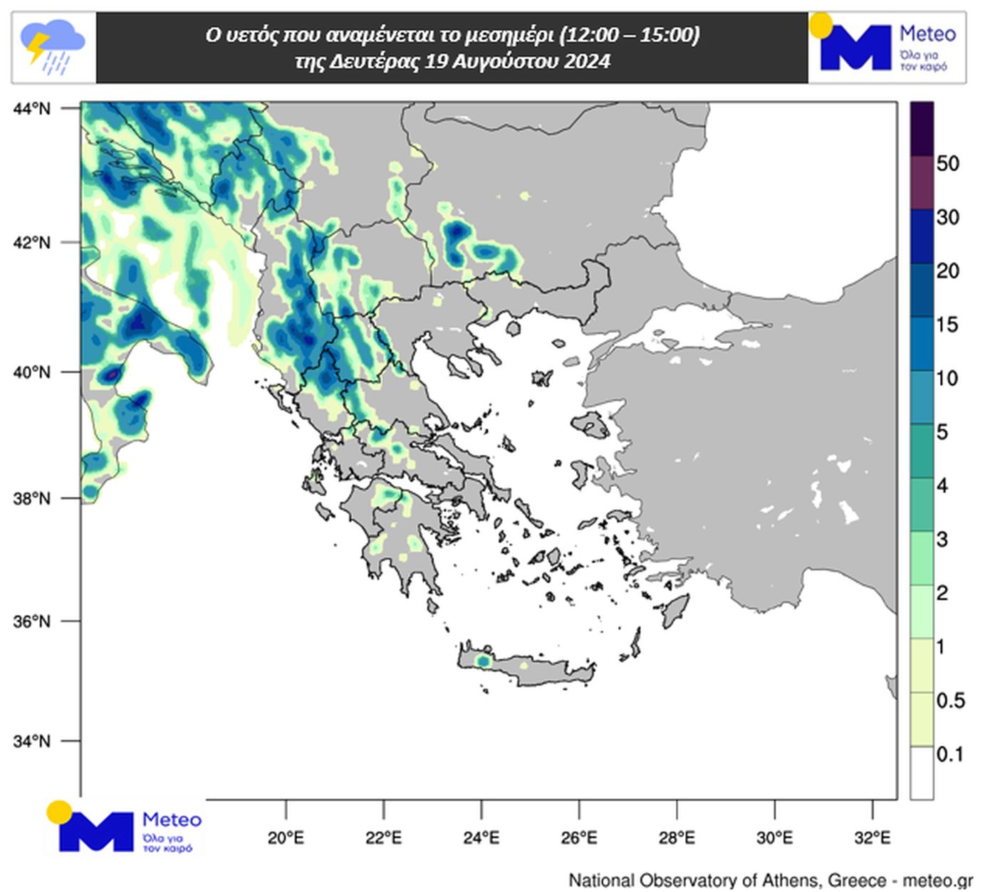 Στους παρακάτω χάρτες παρουσιάζεται ενδεικτικά ο υετός που αναμένεται το μεσημέρι και τις πρώτες απογευματινές ώρες της Δευτέρας 19/08: