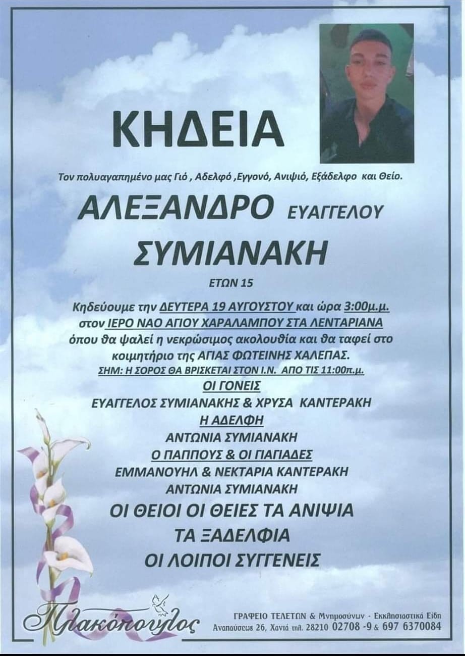 Λίγη ώρα αργότερα, στις 3 το μεσημέρι, αποχαιρέτησαν τον 15χρονο Αλέξανδρο Συμιανάκη από τον Ιερό Ναό Αγίου Χαραλάμπους στα Λενταριανά.