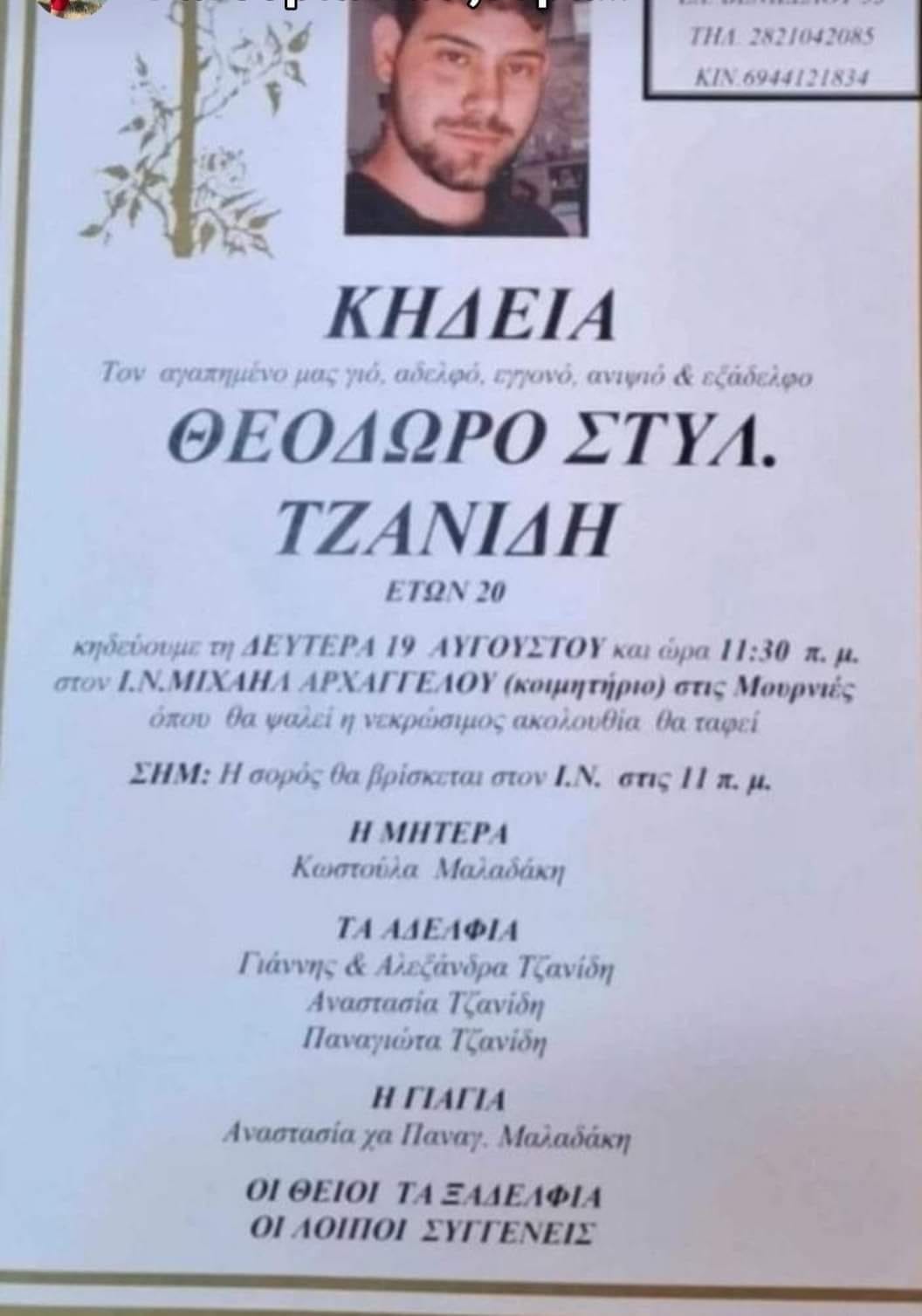 Φίλοι, συγγενείς και πλήθος κόσμου απηύθυναν το ύστατο χαίρε στον 20χρονο Θοδωρή Τζανιδάκη στον Ιερό Ναό Μιχαήλ Αρχαγγέλου στις Μουρνιές στις 11:30 το πρωί.