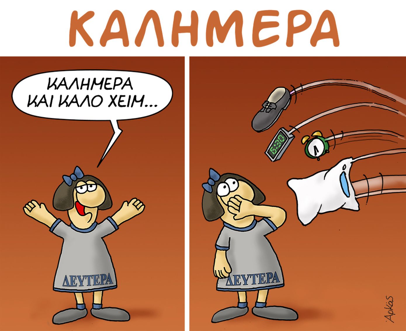 Η σημερινή «Δευτέρα» είναι πρωταγωνίστρια στο σκίτσο του Αρκά. Ετοιμάζεται να πει «καλημέρα και καλό χειμώνα», αλλά πριν τελειώσει τη φράση της, της πετούν μαξιλάρι, ξυπνητήρια και παπούτσι.
