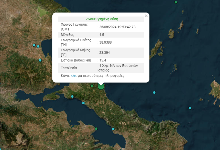 Η σεισμική δόνηση ήταν, σύμφωνα με το Γεωδυναμικό Ινστιτούτο, μεγέθους 4,5 Ρίχτερ και το επίκεντρο εντοπίζεται στη Βόρεια Εύβοια, 4 χιλιόμετρα νοτιοανατολικά των Βασιλικών.
