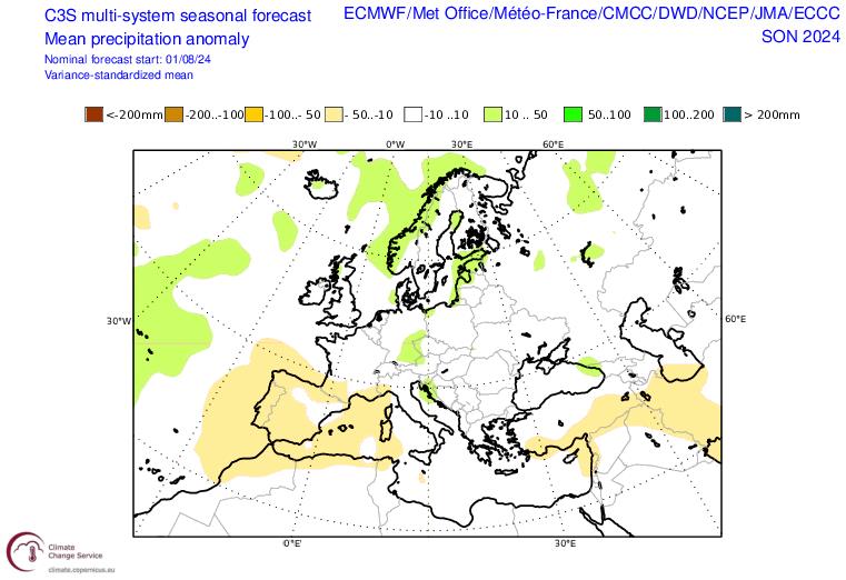 Ειδικά για την Ελλάδα, ενώ το multi-model εκτιμά ότι οι βροχοπτώσεις του φθινοπώρου θα κινηθούν στα φυσιολογικά επίπεδα, με βάση το ECMWF, υπάρχουν ενδείξεις για μειωμένες βροχοπτώσεις στα ανατολικά.