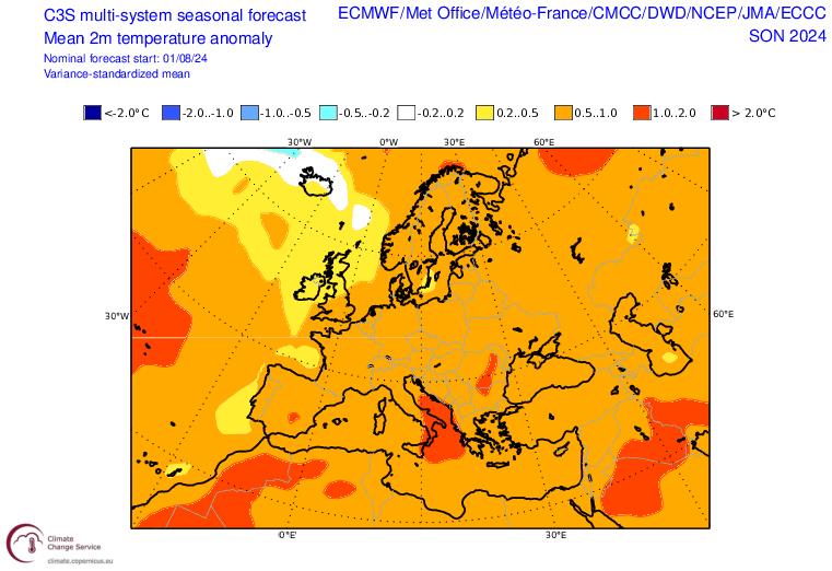 Τόσο από το μακροπρόθεσμο μοντέλο του ECMWF, όσο και από το σύστημα πολλαπλών μοντέλων (multi-modelsystem) φαίνεται θερμό θερινό μοτίβο για το φθινόπωρο. Ειδικότερα, προβλέπονται θετικές αποκλίσεις της θερμοκρασίας γενικά πάνω από την Ευρώπη, με μόνη εξαίρεση την περιοχή μεταξύ Ισλανδίας-Γροιλανδίας, όπου εμφανίζονται πιθανότητες για αρνητικές αποκλίσεις. Σύμφωνα με το ECMWF, οι θετικές αποκλίσεις στις περισσότερες Ευρωπαϊκές περιοχές προβλέπεται ότι θα κυμαίνονται από 0,5 μέχρι 1 βαθμό Κελσίου, ενώ τοπικά στα βόρεια της Σκανδιναβίας, αλλά και σε πολλές περιοχές στα κεντρικά και νότια, όπως στην Ισπανία, την Ιταλία, τα Βαλκάνια, την Τουρκία και τοπικά στην ανατολική Μεσόγειο θα ξεπερνούν το 1 βαθμό και μπορεί να φθάνουν και τους 2 βαθμούς Κελσίου. Η μόνη διαφωνία του multi-model είναι ότι οι περιοχές που θα δουν θετικές αποκλίσεις πάνω από 1 βαθμό Κελσίου θα είναι λιγότερες από αυτές που εκτιμά το ECMWF.