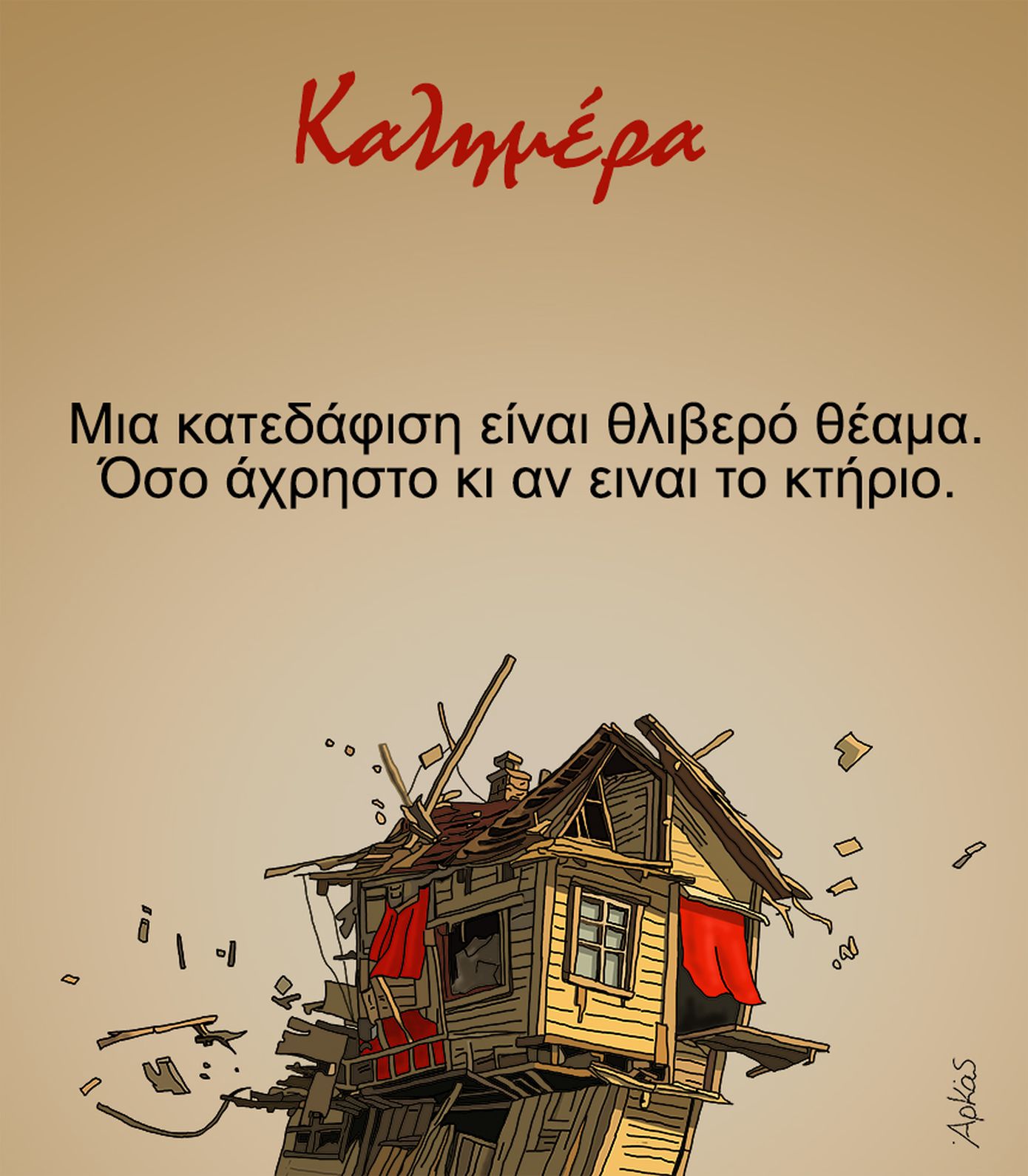 Τη δική του «καλημέρα» λέει και σήμερα, Τετάρτη 28/8 ο Αρκάς με πρωταγωνιστή στο σκίτσο του αυτή τη φορά ένα κατεδαφισμένο κτίριο.
