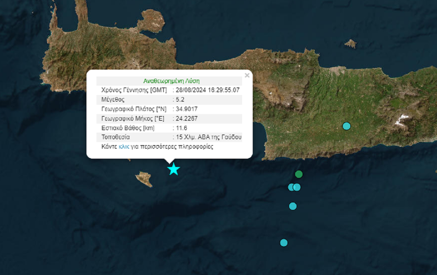 Ισχυρός σεισμός μεγέθους 5,2 Ρίχτερ σημειώθηκε ανοιχτά της Κρήτης το απόγευμα της Τετάρτης 28 Αυγούστου.