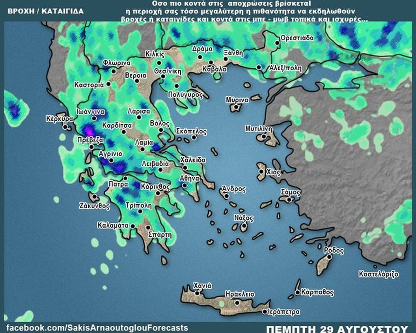 Ο κ. Λαγουβάρδος σημειώνει, μεταξύ άλλων: «Από την Πέμπτη 29/8 και τουλάχιστον μέχρι το Σάββατο 31/8 προβλέπεται ενίσχυση της αστάθειας, με καταιγίδες να επηρεάζουν μεγάλο μέρος της χώρας. Με τα σημερινά προγνωστικά δεδομένα (Τετάρτη 28/8), η πιθανότητα χαλαζοπτώσεων είναι μικρή, όμως θα είναι αυξημένος ο κίνδυνος πλημμυρικών φαινομένων, καθώς προβλέπεται μεγάλη ραγδαιότητα βροχοπτώσεων και μεγάλος αριθμός ηλεκτρικών εκκενώσεων».