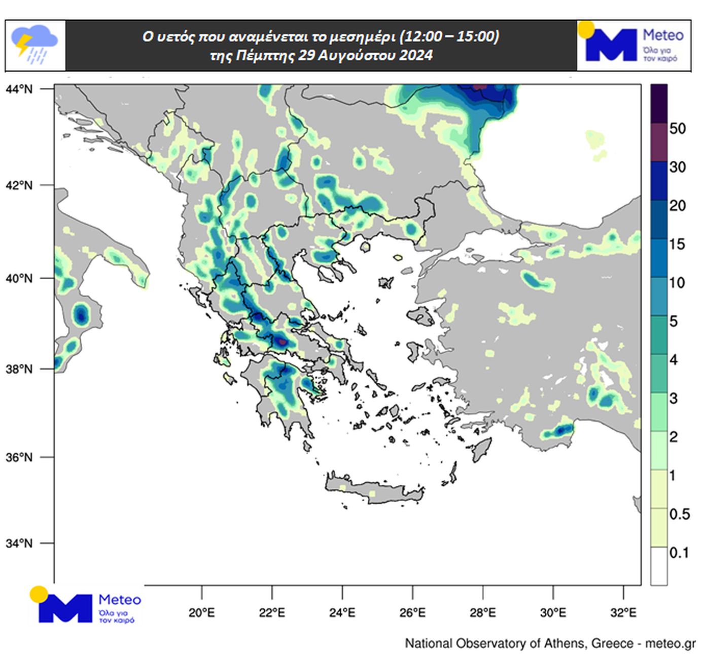 Βροχές και τοπικές καταιγίδες προβλέπονται για τον νομό Θεσσαλονίκης και κυρίως τα δυτικά και βόρεια τμήματα της Αττικής. Στους χάρτες που ακολουθούν παρουσιάζεται ο υετός που αναμένεται το μεσημέρι και το απόγευμα της Πέμπτης 29/08.