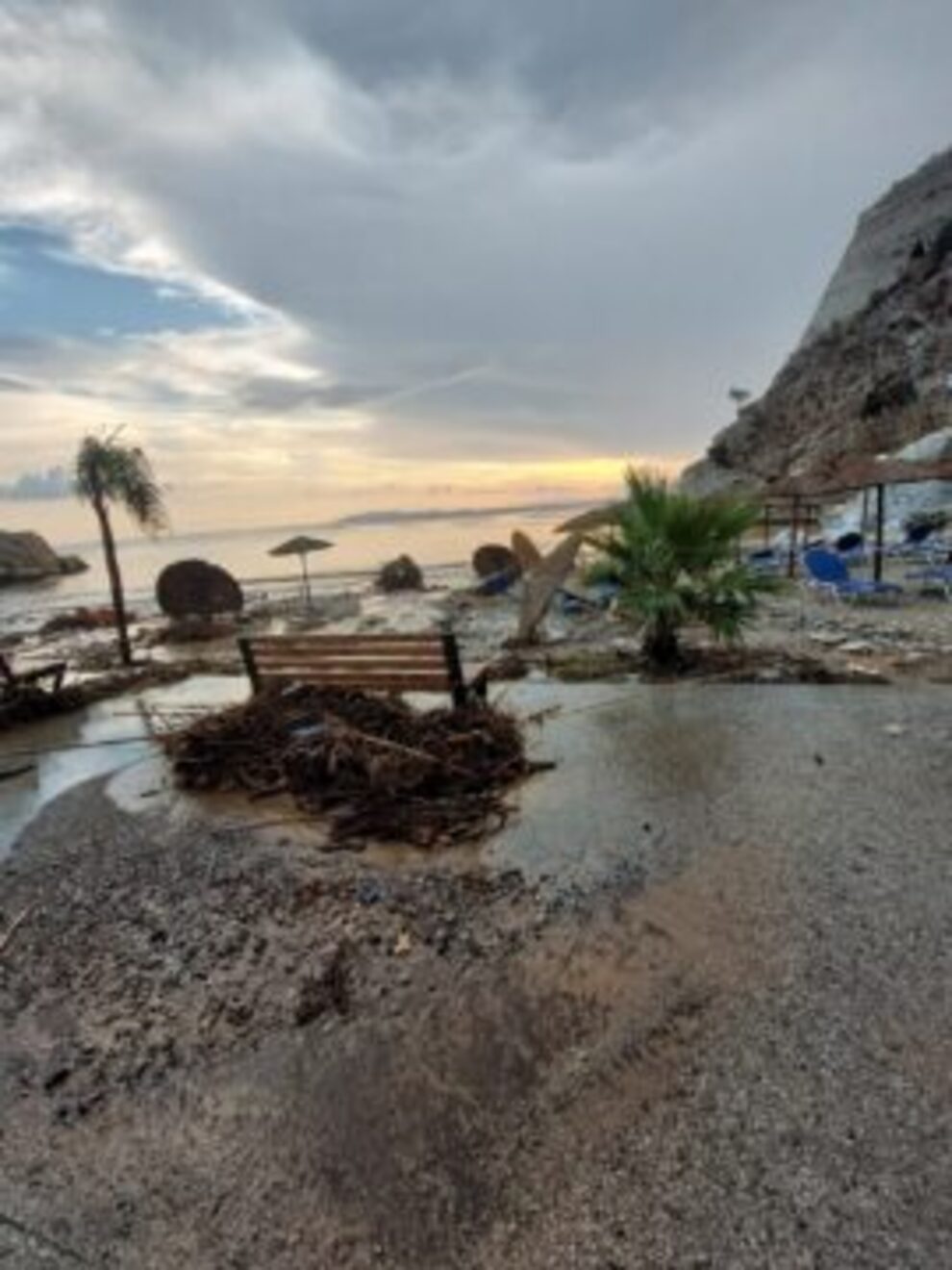 Εκτός από τα αυτοκίνητα, το νερό παρέσυρε κάδους απορριμμάτων, ομπρέλες και ξαπλώστες από την παραλία, ενώ ζημιές υπέστη μια ταβέρνα της περιοχής.