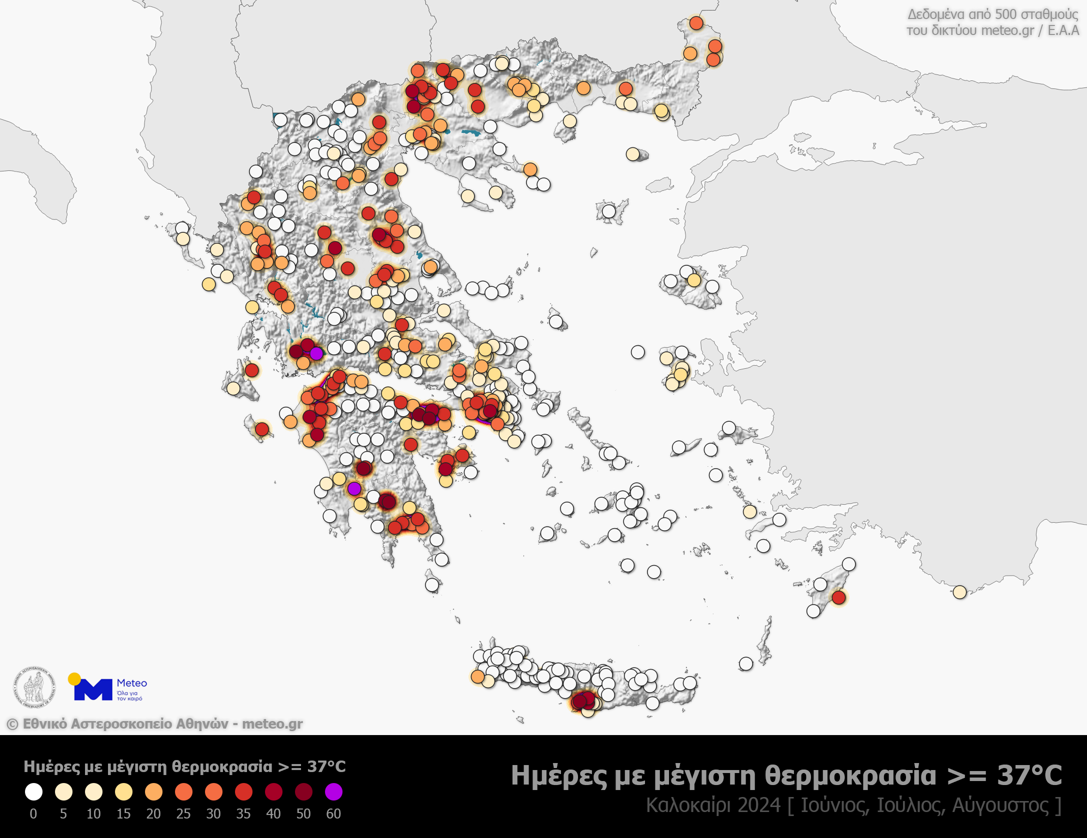 Το κύριο χαρακτηριστικό του φετινού καλοκαιριού ήταν οι πολλές και συνεχόμενες ημέρες με πολύ υψηλές θερμοκρασίες κατά τη διάρκεια της ημέρας αλλά και της νύχτας (κυρίως στα μεγάλα αστικά κέντρα). Για πολλές ημέρες σε αρκετές περιοχές της χώρας η θερμοκρασία ξεπέρασε τους 37 °C. Στην εικόνα που ακολουθεί, παρουσιάζονται για κάθε μετεωρολογικό σταθμό οι συνολικές ημέρες κατά τη διάρκεια των καλοκαιρινών μηνών του 2024 όπου η μέγιστη θερμοκρασία ξεπέρασε τους 37°C.