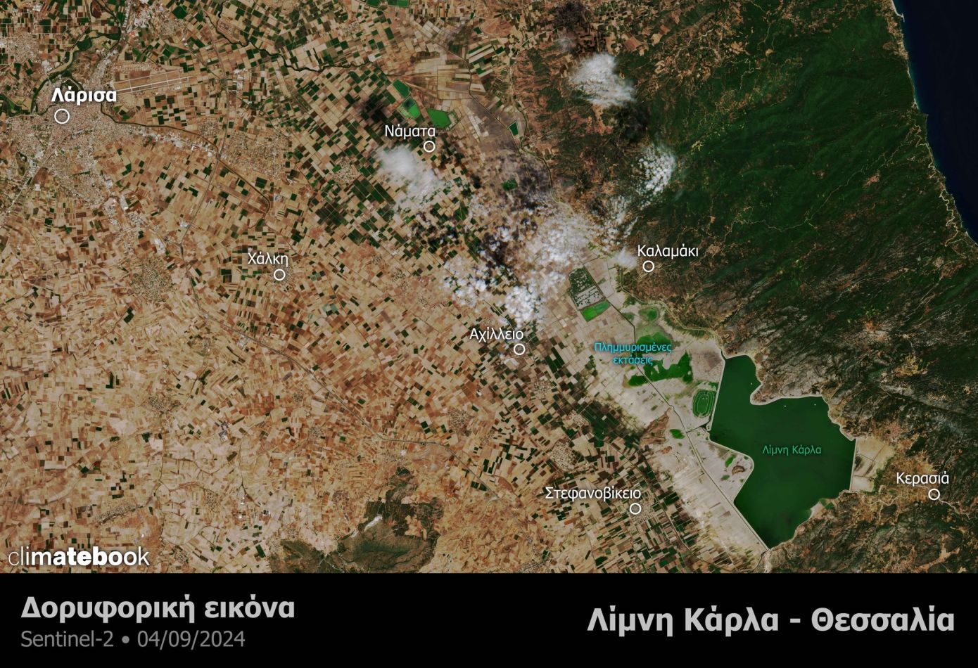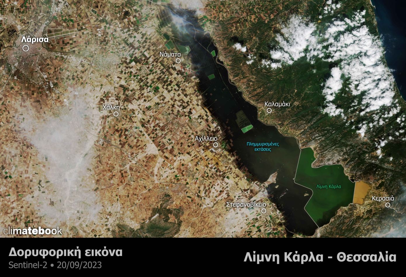 Μέσα στις πλημμυρισμένες εκτάσεις και η περιοχή της Ανατολικής Θεσσαλίας και κυρίως η περιοχής της λίμνης Κάρλα όπου ξανά σχηματίστηκε η λίμνη που είχε αποξηρανθεί πριν αρκετά χρόνια, με την έκτασή της στις 20 Σεπτεμβρίου 2023 να φτάνει περίπου τα 190 χιλιάδες στρέμματα.